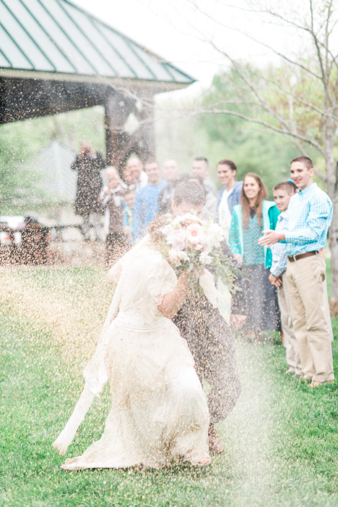 At the end of the reception our plan was to leave in a 1946 Chevrolet. But on the day of the wedding, the car rental company sent their driver to our venue in a 1968 Cadillac. It wasn’t quite the look we were going for, but we decided to make it work anyway. Our coordinator got all of the guests lined up for the birdseed showering so we could run down to the car. All seemed to be going as planned until we began to drive away in the car. The plan was to loop back through for the photographer to get more photos of my husband and I with the vintage car. After the photos were done, the driver would then take us in the car and drop us off at our home three miles from the venue.