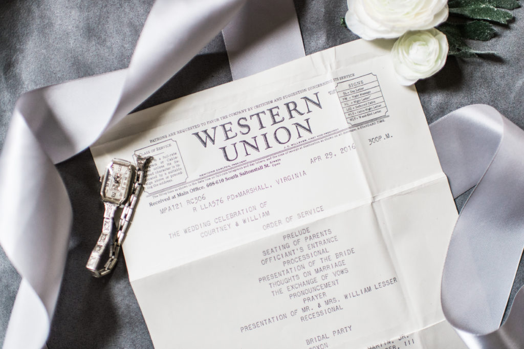 For the guestbook, I found a real fountain pen. We typed the programs up ourselves as Western Union telegrams, and we used my grandfather’s typewriter on the guestbook table. The music we played while the guests were being seated were all vintage-era songs, but we also included our grandparents’ favorite songs in the mix. The flower girls, for instance, walked down the aisle to the song my grandmother used to sing to me when I was a little girl.