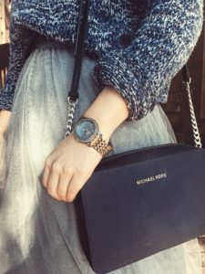 To finish off the outfit with a black tights (a winter staple), heeled combat boots by Steve Madden, and a navy and black, color-blocked bag by Michael Kors.