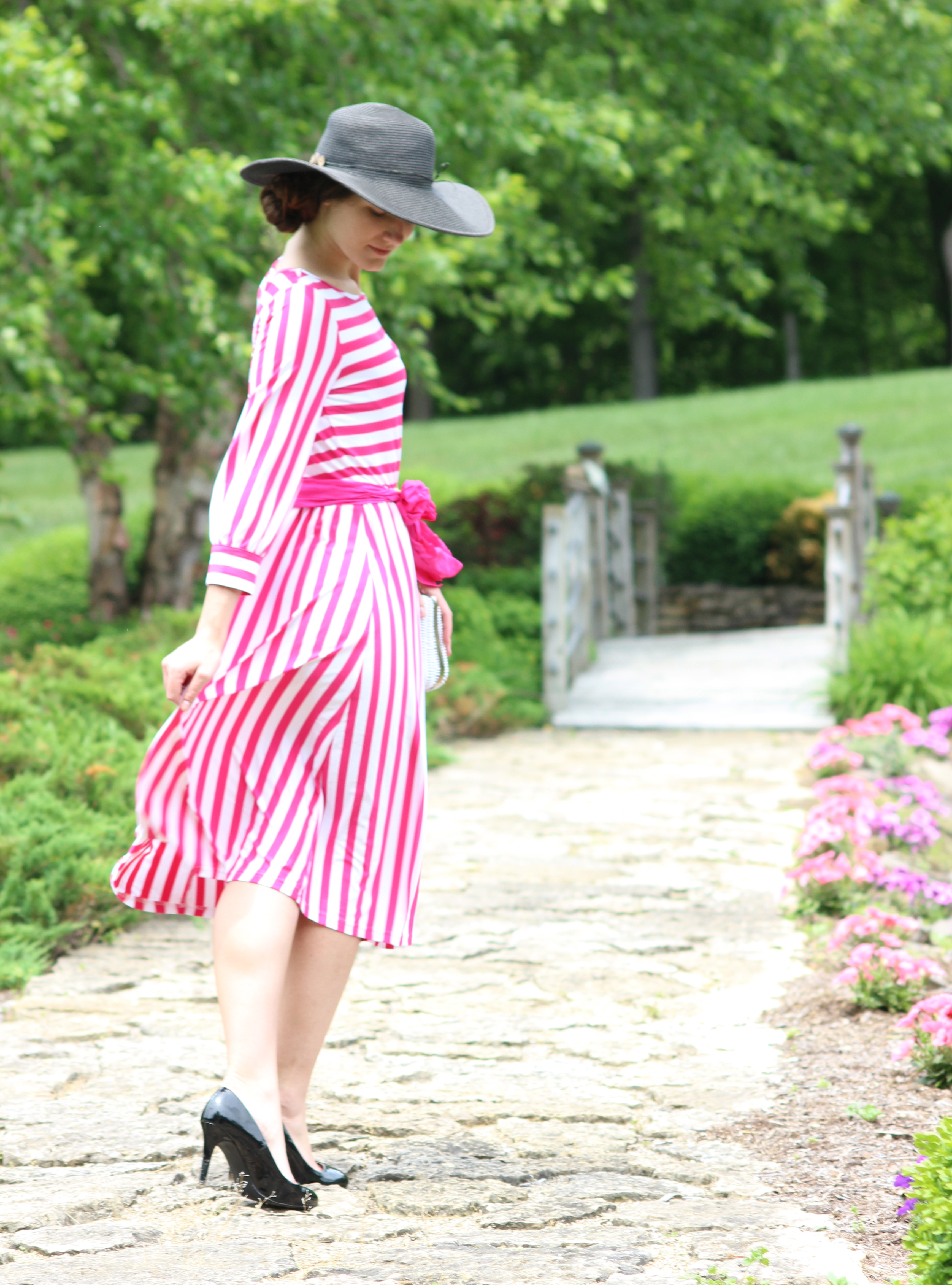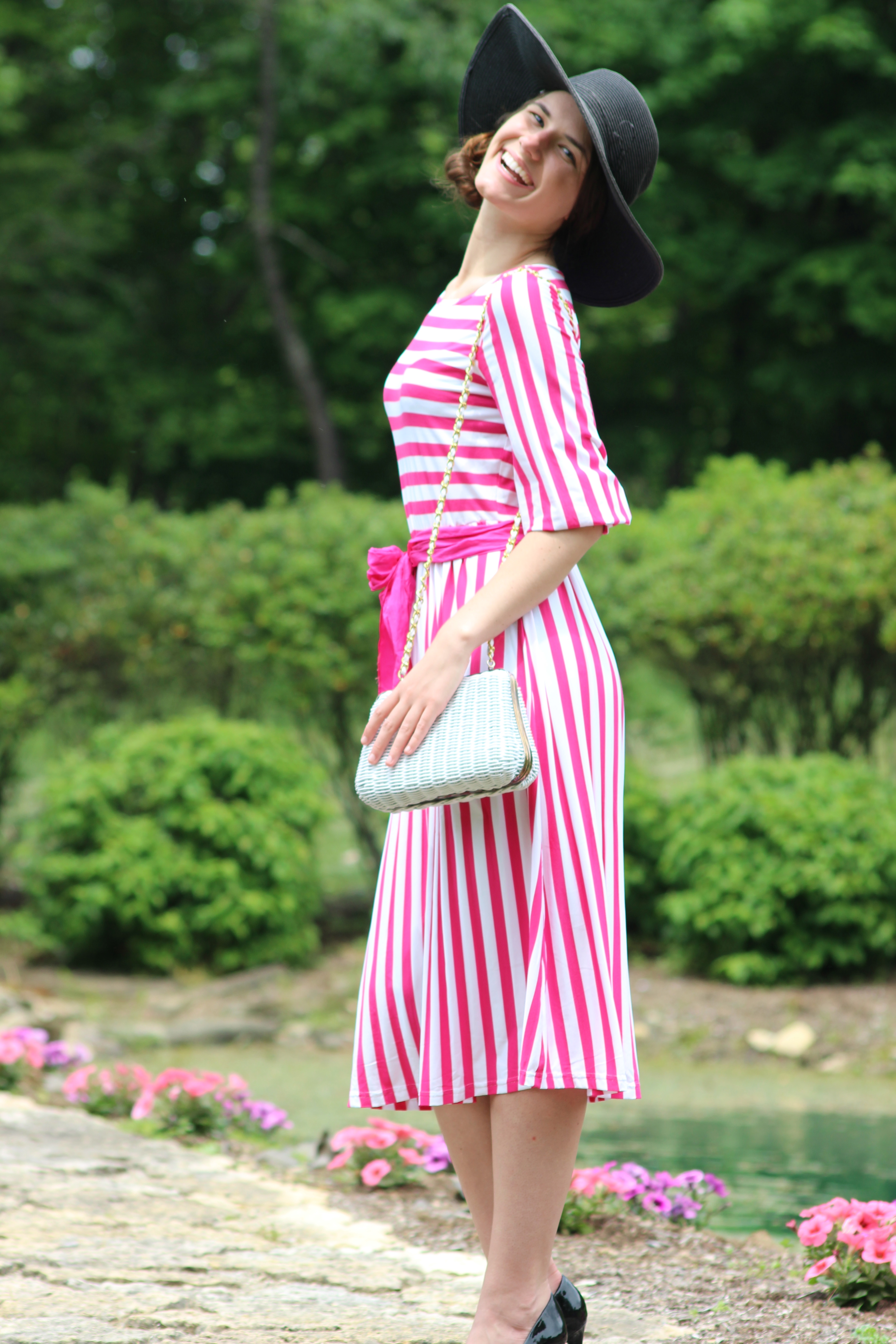 Not only does this eye-catching dress look completely feminine and fun, but it’s quick and easy. Thus, you’re ready go as soon as you slip it on. Wearing a black floppy hat is a must for a dress like this as it adds such a natural look of grace, poise, dignity, and charm. Also, it’s best to fix your hair in a small side-do with a hat and dress such as this. Since the hat already draws an excessive amount of attention, you wouldn’t want to over-do it by wearing your hair down. This would only take away from the outfit! Having a polished look along with a stylish side-do presents a well put-together appearance. On days that you are wanting to adventure for a new level of sophistication, try investing in a black, floppy. You can wear them with almost any dressy summer attire. I like to purchase mine at Stein Mart (their prices are reasonable).