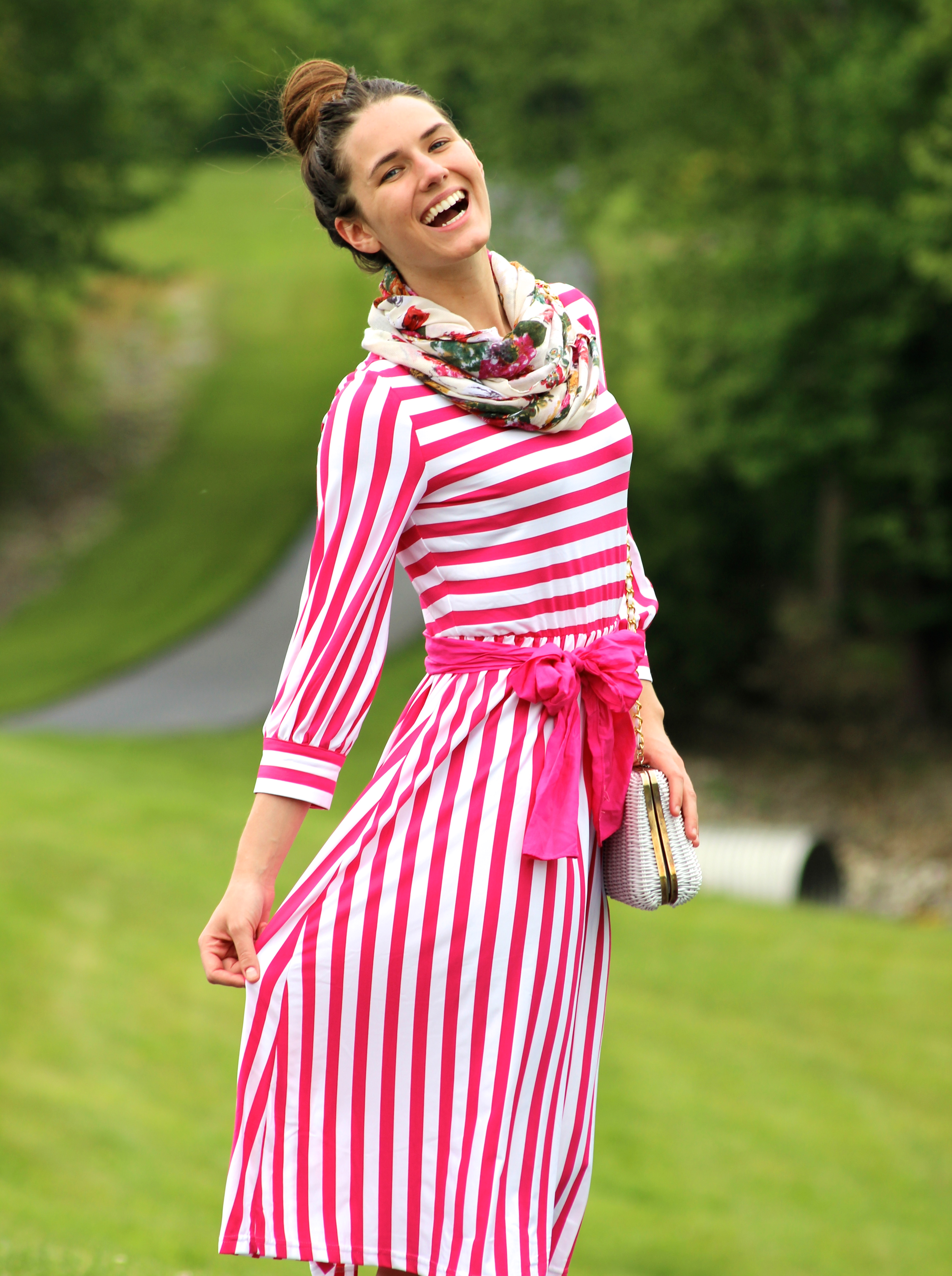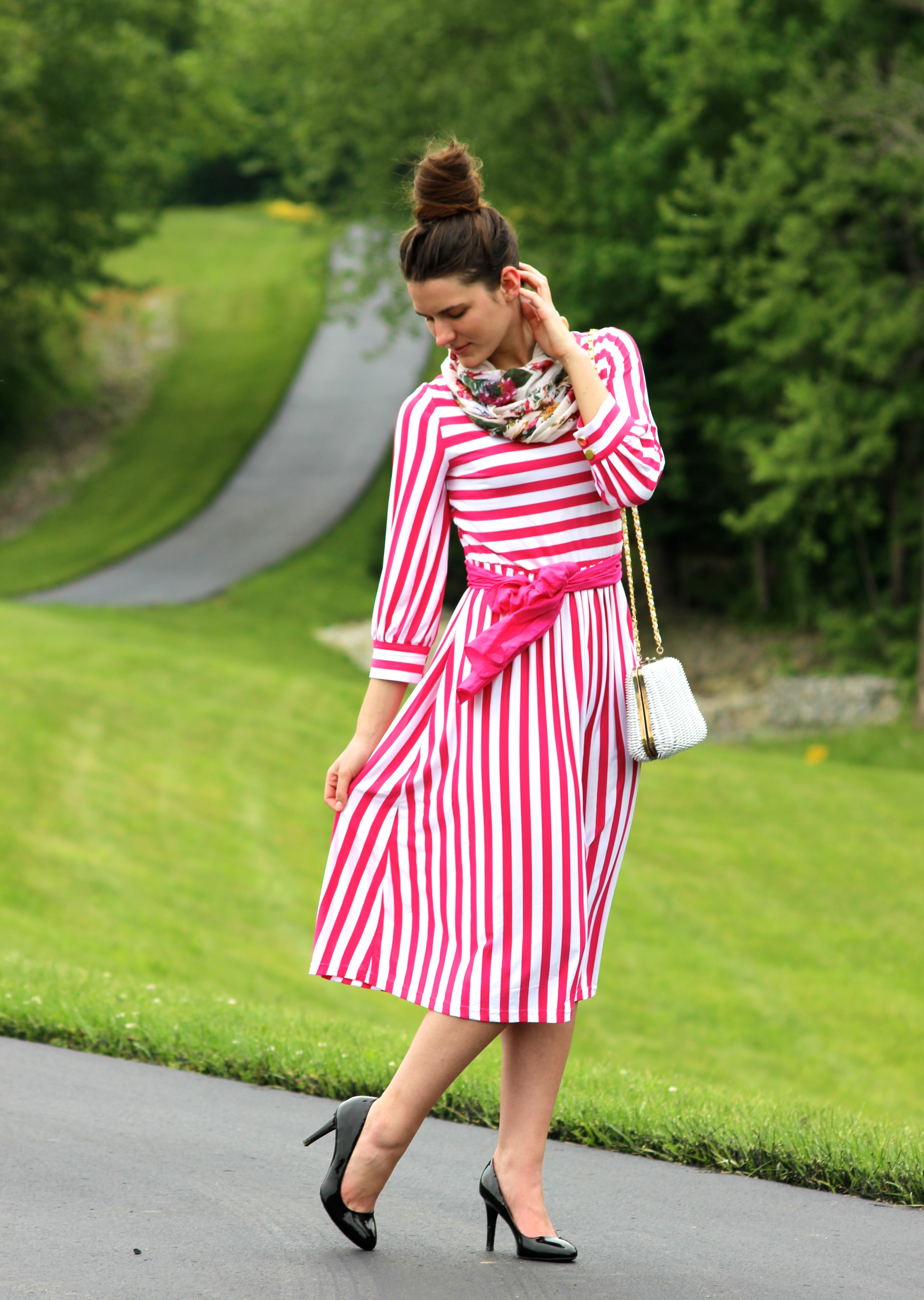 Now, I decided to switch the attire up a little bit to give an example of what it would appear like without the summer hat. Wearing a scarf, belt, and hat would definitely be too busy to wear all at once. Thus, I wanted to give an illustration of how it’s better to wear it with just a scarf and belt alone. Depending on the outfit, wearing all three accessories (hat, belt, and scarf) together could create an overelaborated attire. Styling a floral scarf with the striped dress brings enough detail to where you wouldn’t necessarily need a hat. Fixing your hair up in a nice top knot or curly bun would be ideal.