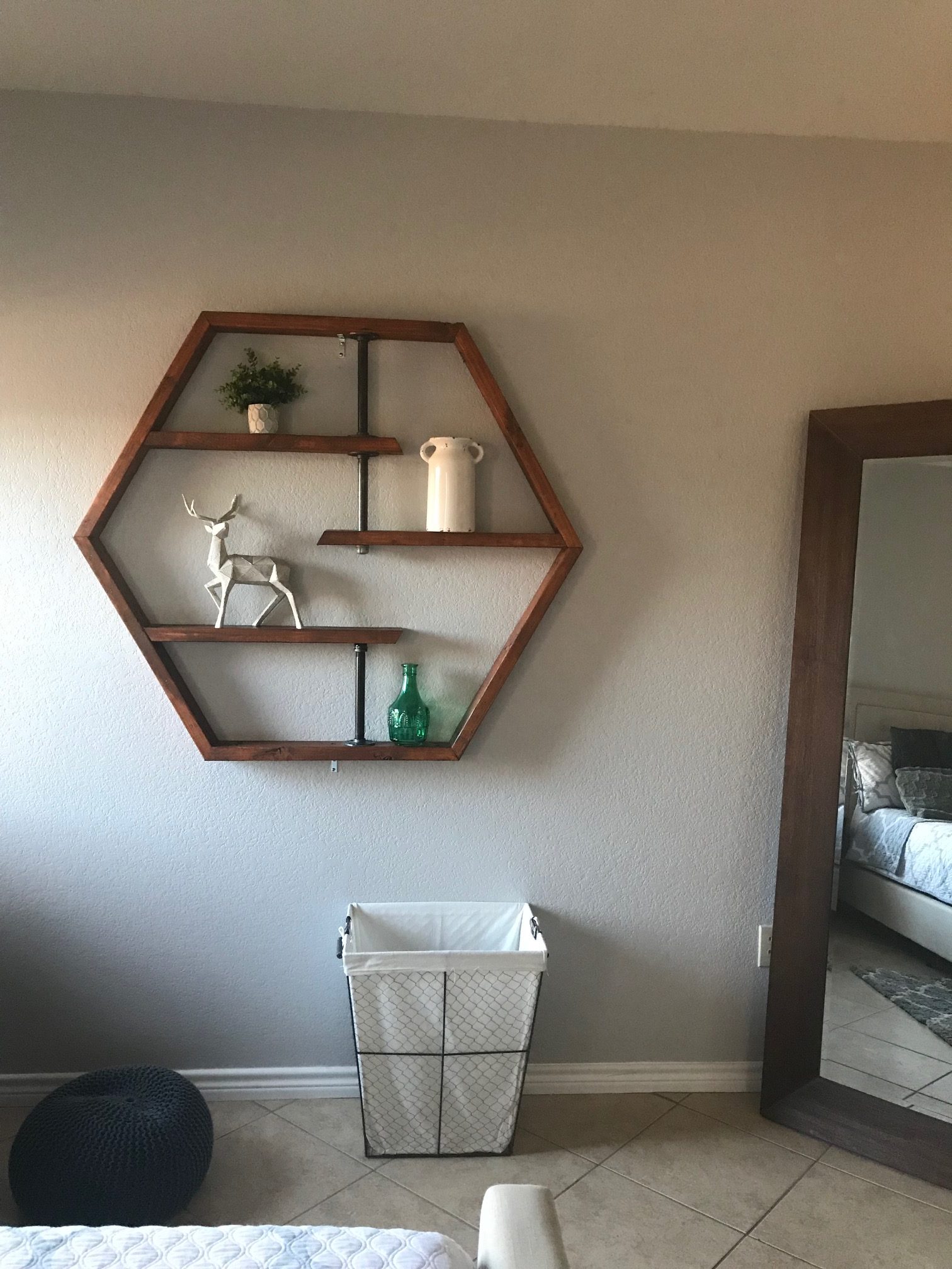 My favorite piece Josh has built so far is the decorative shelf in our bedroom below. I really don’t think pictures do it justice! One thing I love about this piece is that the outer hexagonal shape came from stage props from last year’s holiday youth convention. We’ll always have a piece of that conference with us!