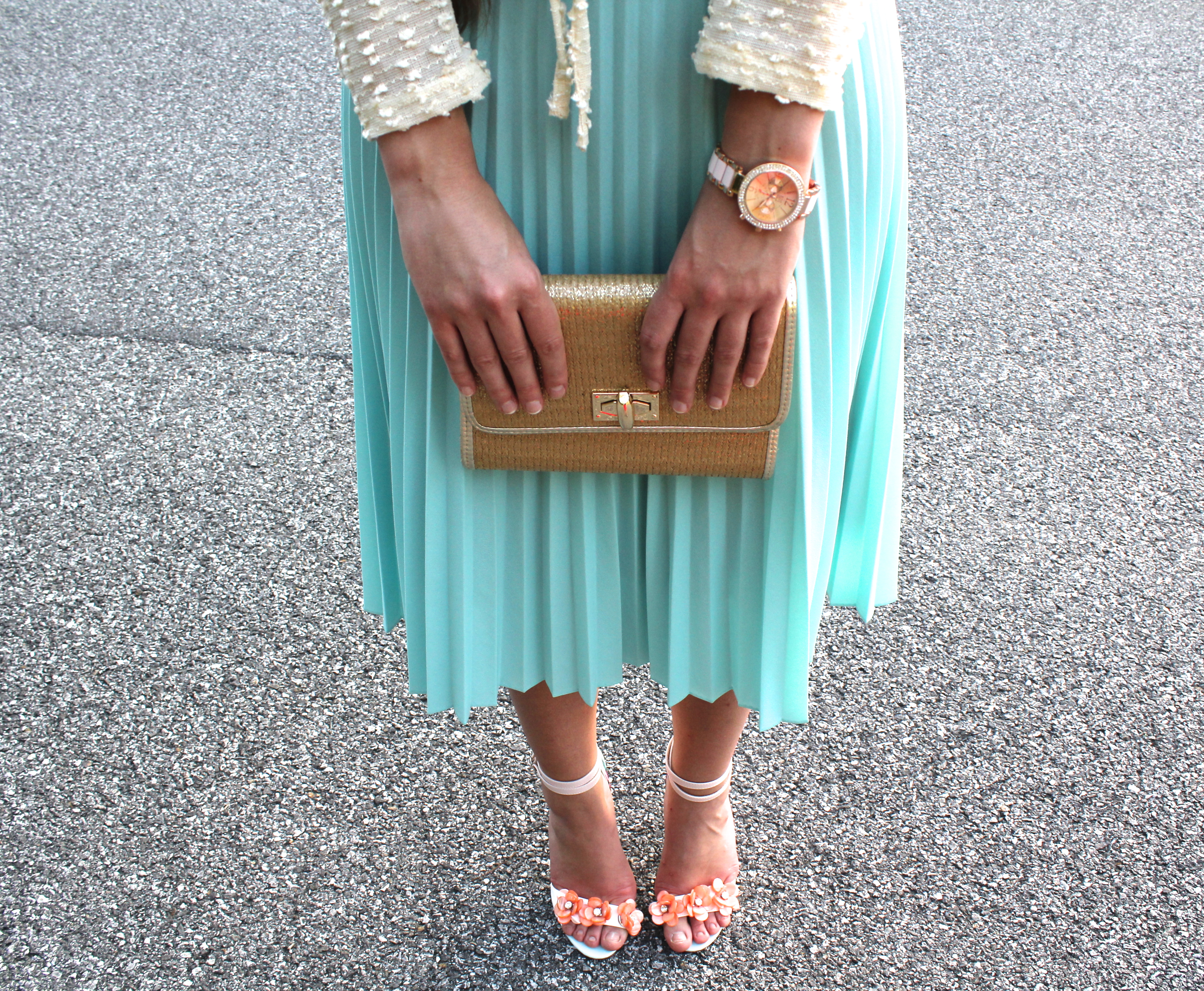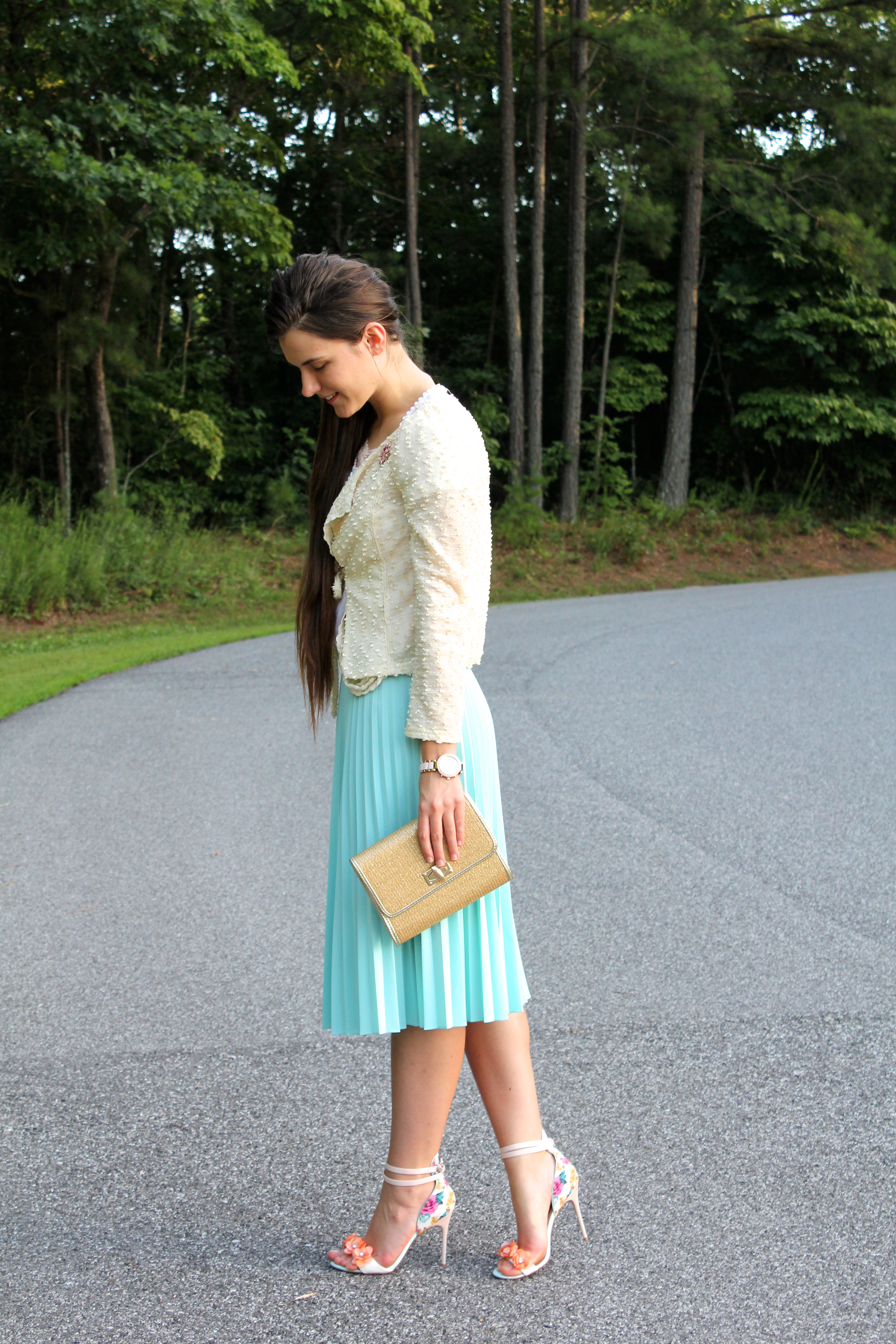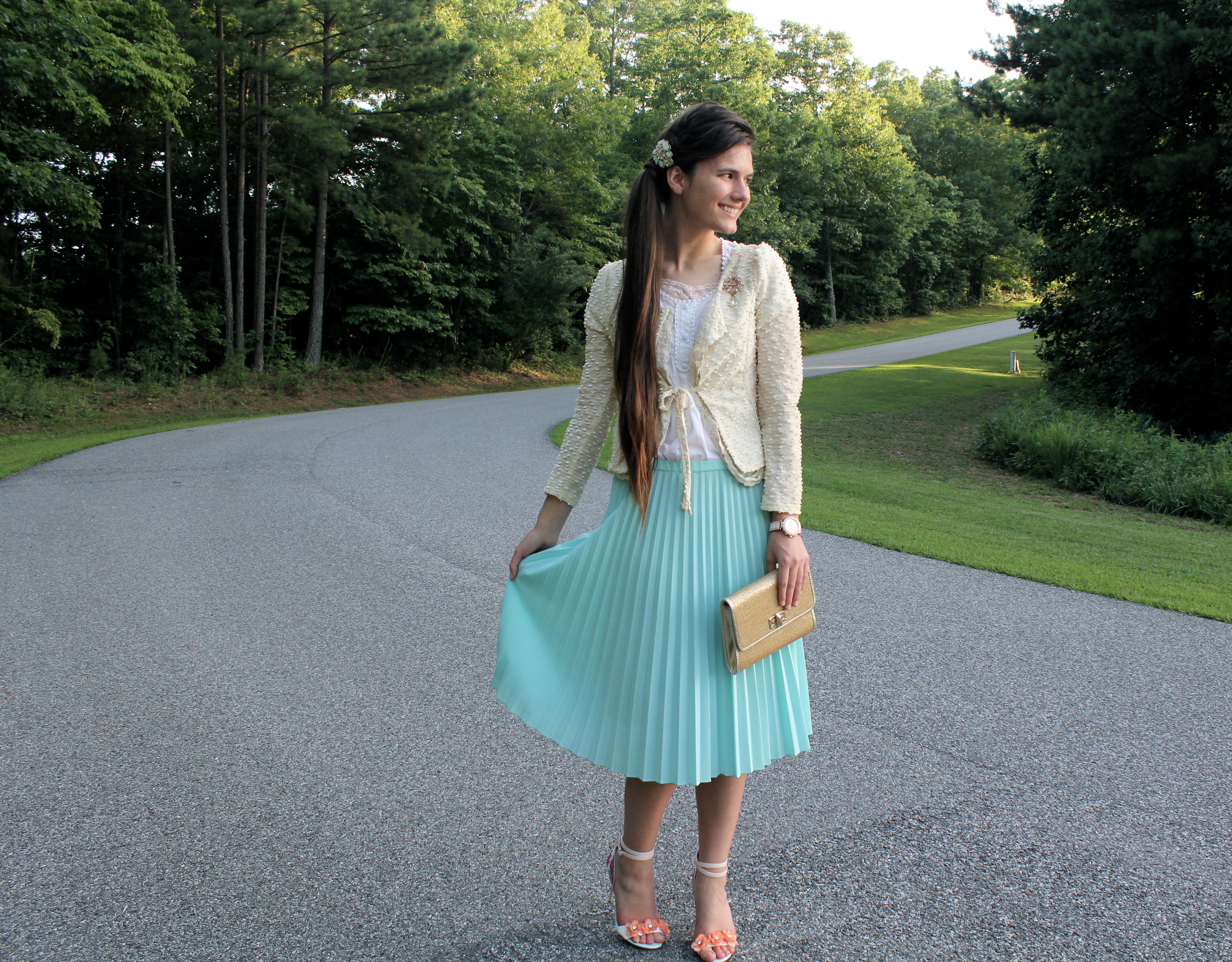 Cardigan: TJ Maxx | Blouse: Stein Mart | Skirt: Goodwill | Heels: Von Maur | Watch: New York & Company | Barrette: Icing | Purse: Francesca’s
