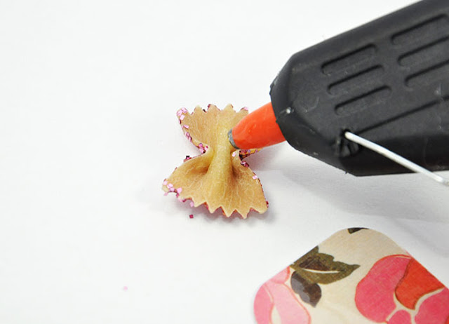 This idea came to me as I made some homemade mac and cheese for a couple of hungry boys. I thought it would be neat to use Farfalle or Bowtie pasta instead of the typical macaroni noodles. My creative mind could not get over the cuteness of the little bows! Immediately, I knew I had to do something with them other than just cook them. What better way than to splash some glitter and add gorgeous florals?