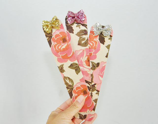 Flip your glitter bow around, add a dab of hot glue, and adhere it to the top of one of your cardstock pieces. Repeat for the rest of the bookmarks and allow about 10 minutes to dry.
