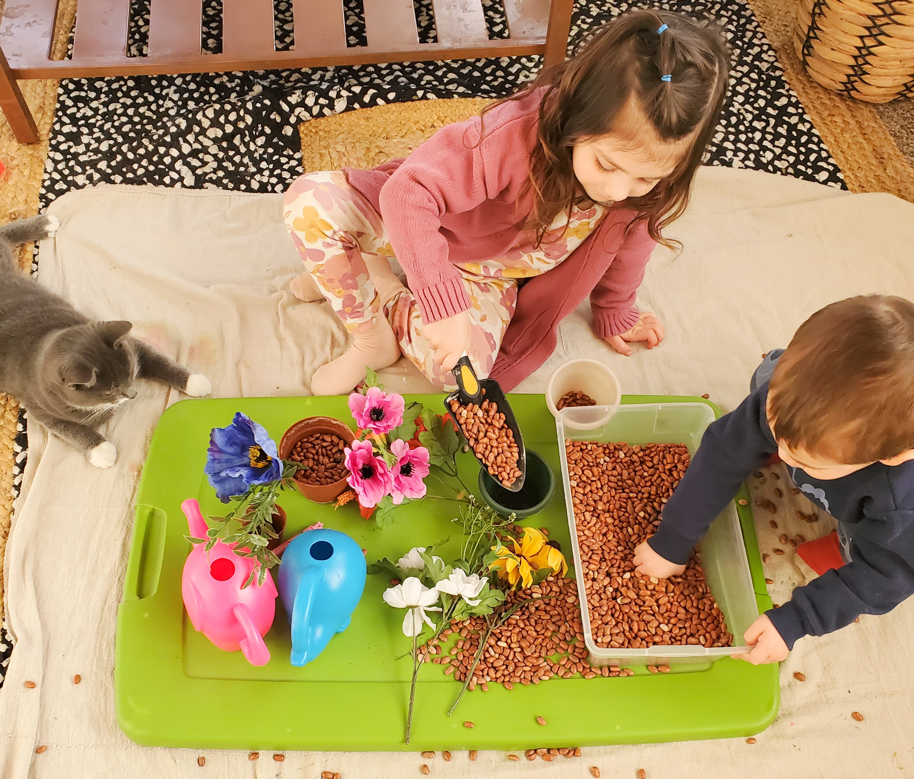 My kids played with this activity for over an hour the first time I introduced them to it! And they asked to do it again soon after. I just stored all the items in the same container as the beans to keep everything tidy and in one place.