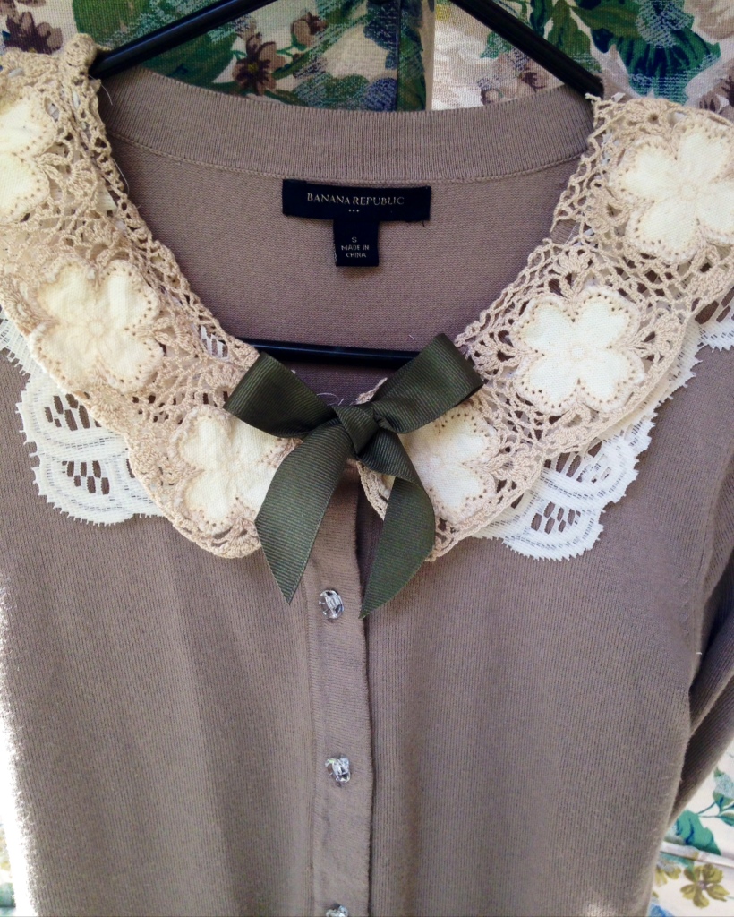 When I have done this to my own items in my wardrobe, I have gotten so many compliments! It gives an outfit a touch of elegance and your own personal flair. You can not only do this with your shirts, but with jackets, sweaters, dresses, cardigans, hats and many other pieces of clothing, as well. There are many ways you can “doll it up” with doilies! Doilies are inexpensive and you can find them at almost any thrift store.