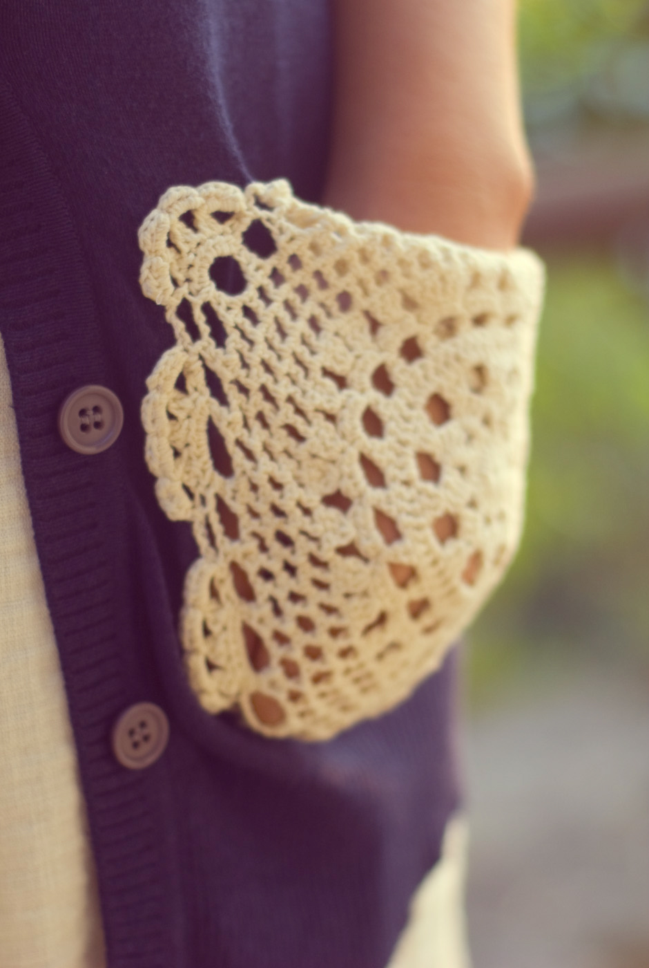 Here are some more examples of what you can do with doilies. After seeing these, I can’t wait to try the pockets and elbow patches! Adding them to your cardigan or sweater gives them its own sense of uniqueness. Furthermore, they come in many different colors, shapes, and sizes, so you will not be limited to just one size or color.