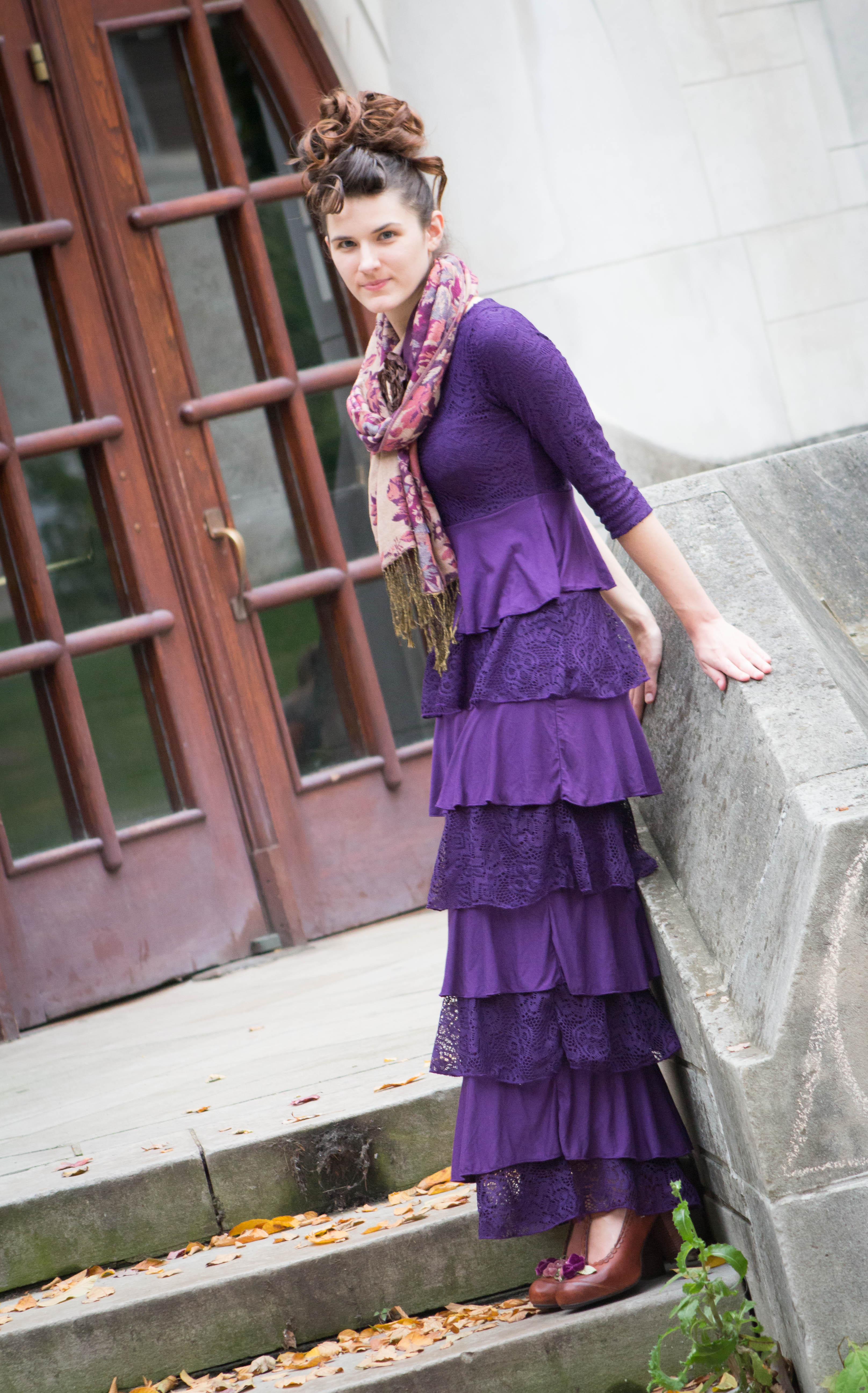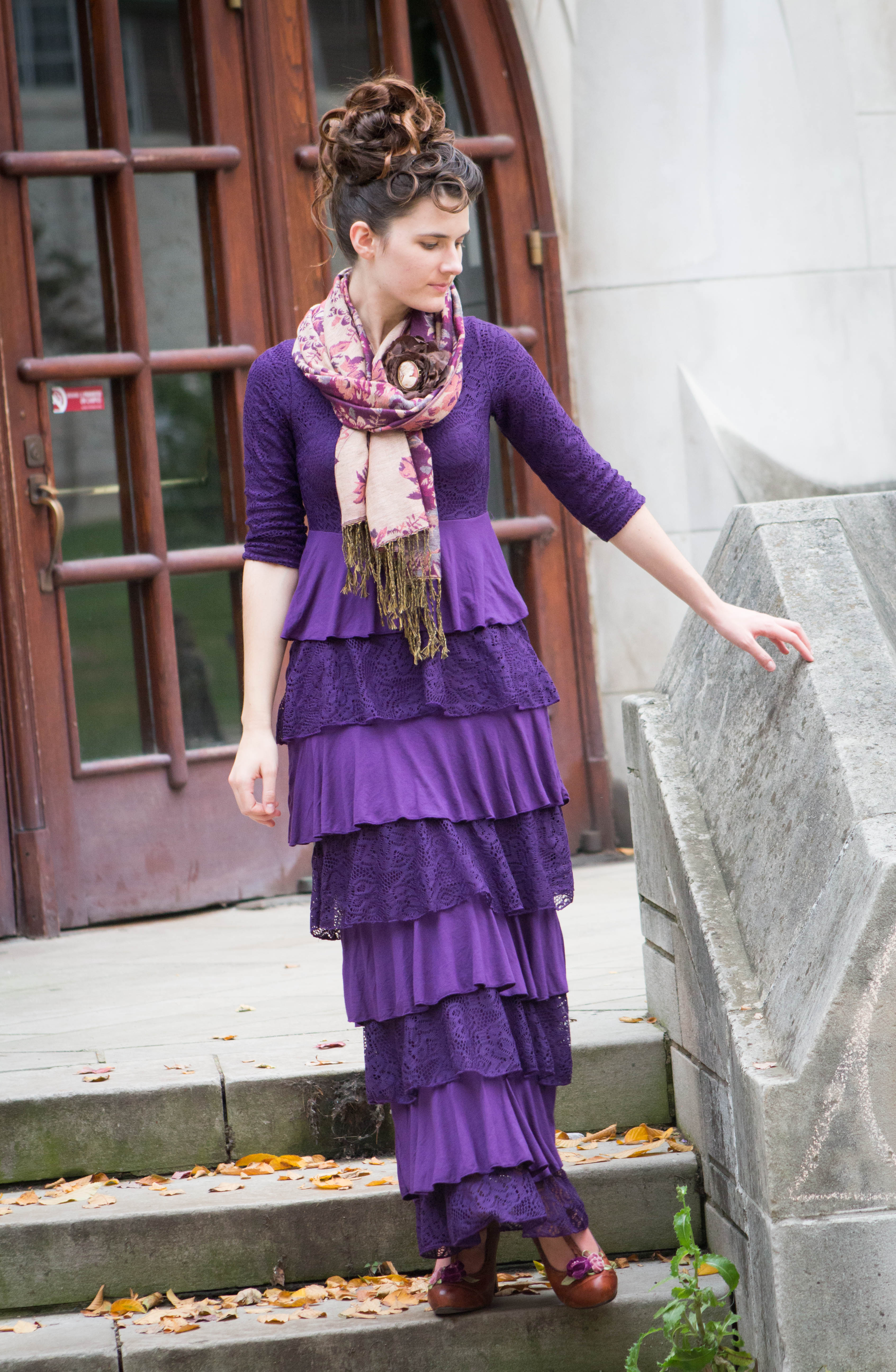 I personally love adding scarves to just about anything, including this dress. I especially loved the mustard green fringe that dangles from the trim of my scarf because this shade of green compliments against the plum dress. Plus, there are many stylish ways you can tie your scarf which makes the entire outfit more delightful. To top it off, I added a cameo brooch fastened off to the side of the scarf to bring a flavor of charm and vintage appeal.
