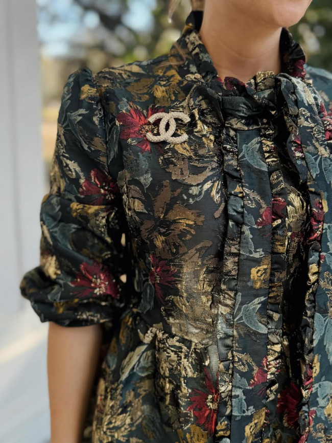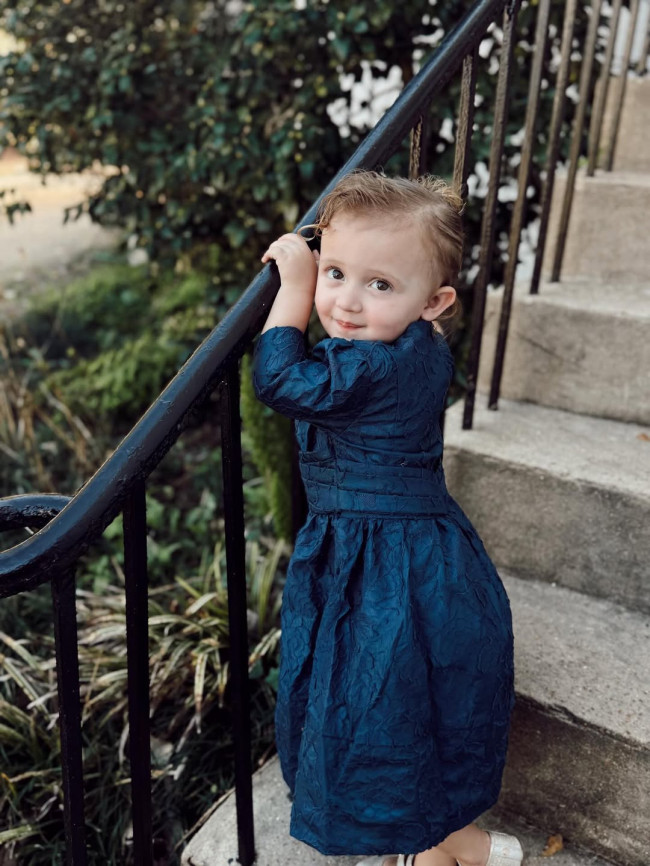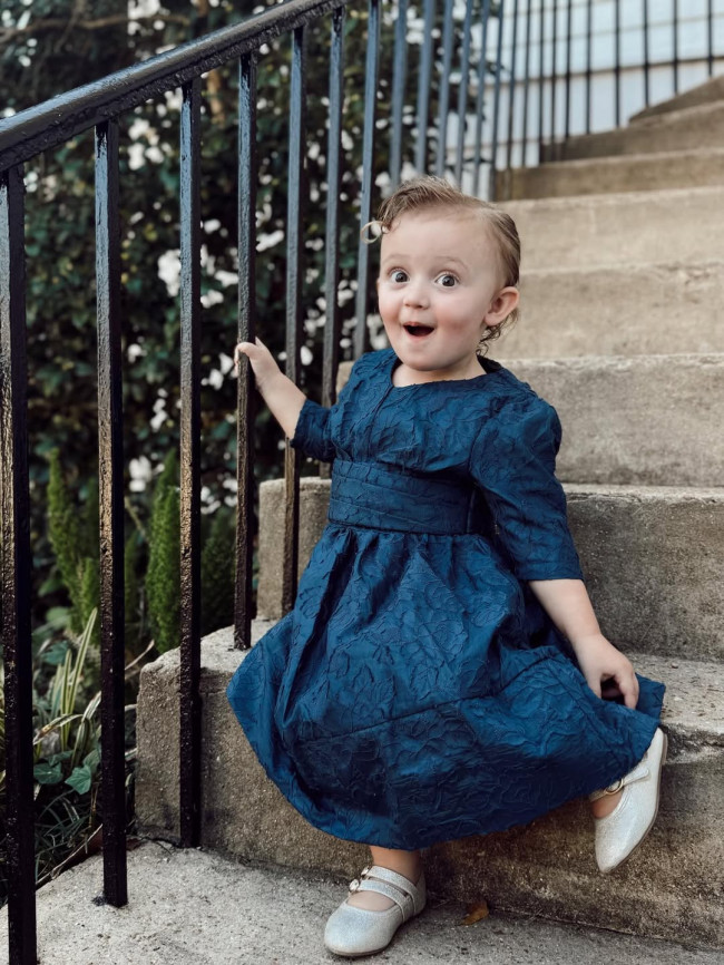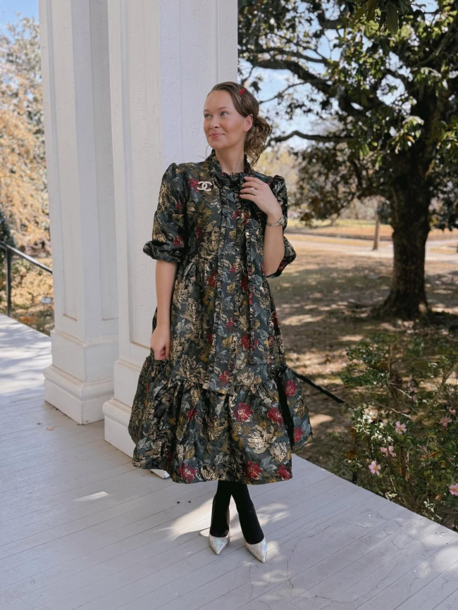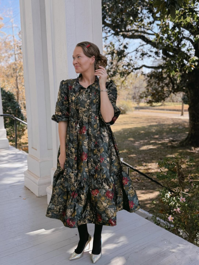 Mandy styled our Winter Gardenia dress in such an elegant way. Metallic heels, opaque black tights, and dainty accessories complete a classy look for church, winter weddings, banquets, family photos, and more!