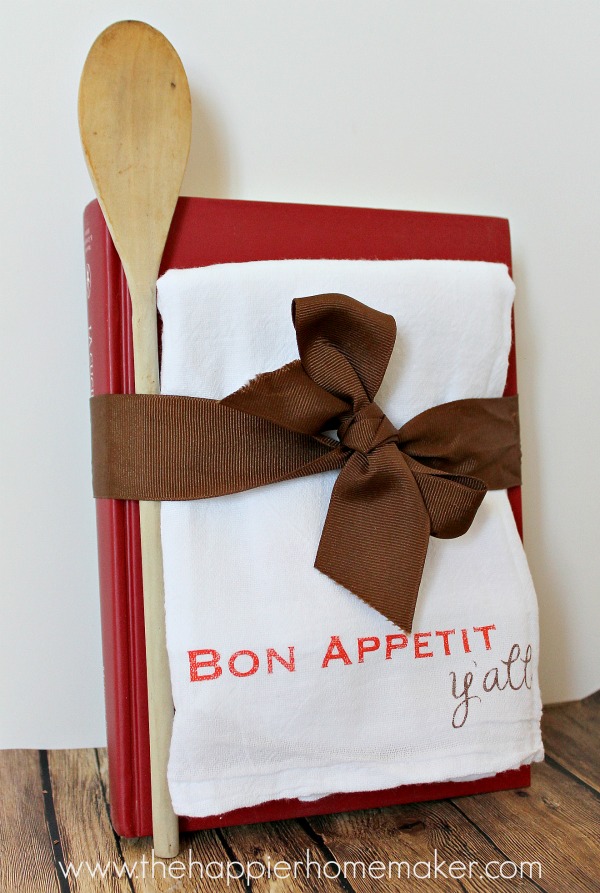 The tutorial in the link above is for the stenciled tea towel, which requires a Silhouette machine. That’s probably not something most women have, but I included this gift because I thought the idea of a recipe book, kitchen utensil, and tea towel wrapped in a ribbon was a lovely gift for those who appreciate the culinary arts.