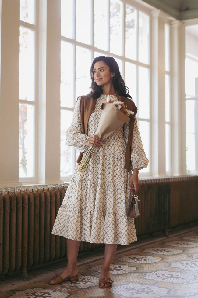 - The Tiered Dress: Both stylish and comfortable, a tiered maxi or midi dress works beautifully for the transition. The silhouette is forgiving and easy to wear, while the multiple tiers add a beautiful, subtle drama.