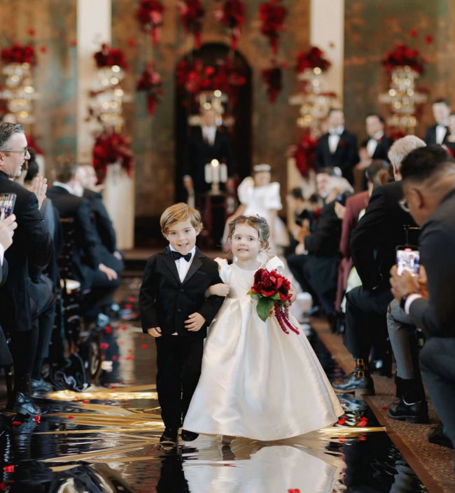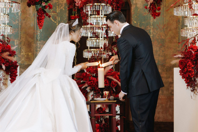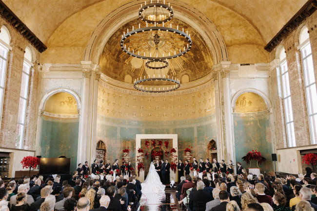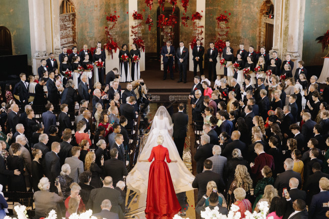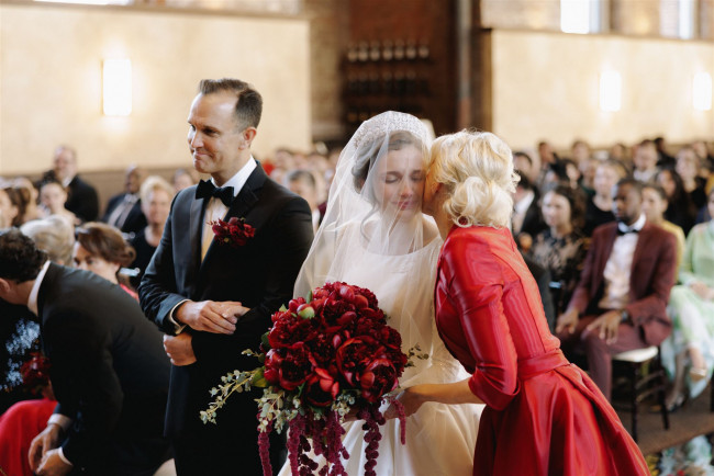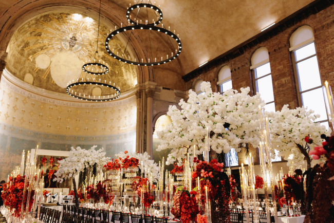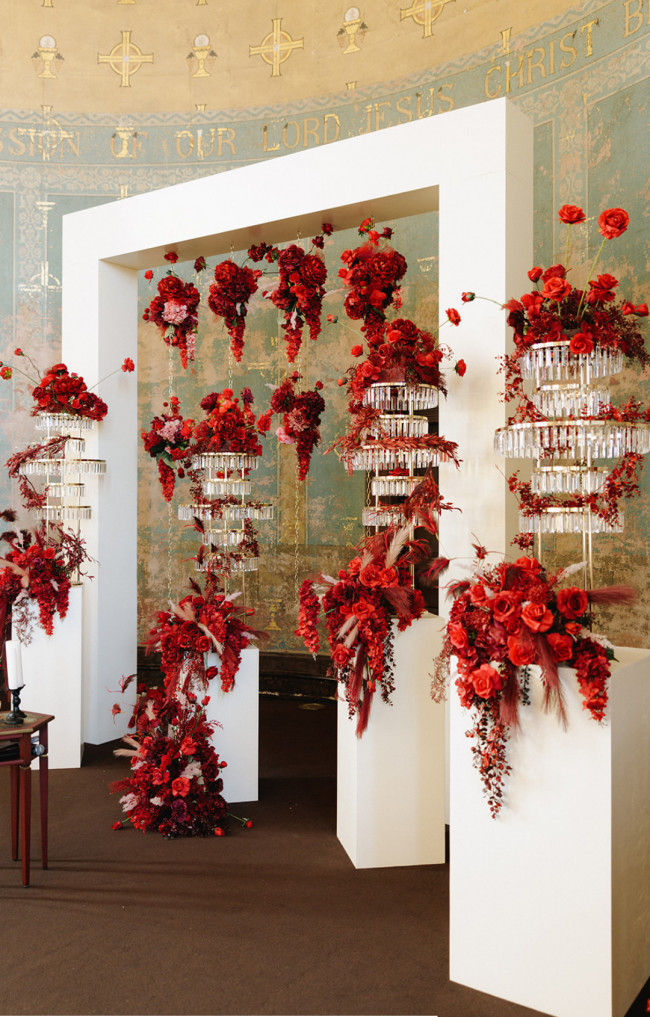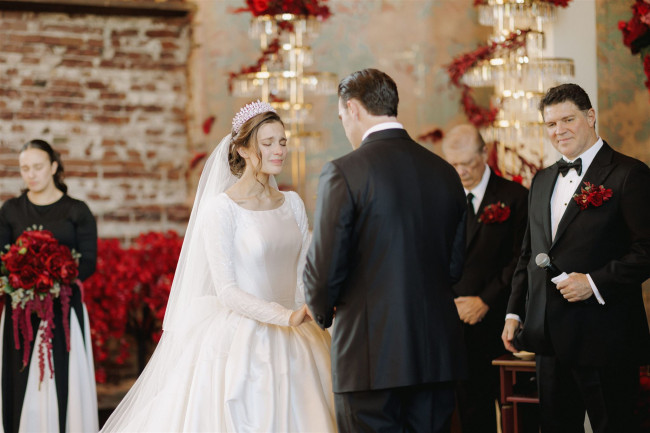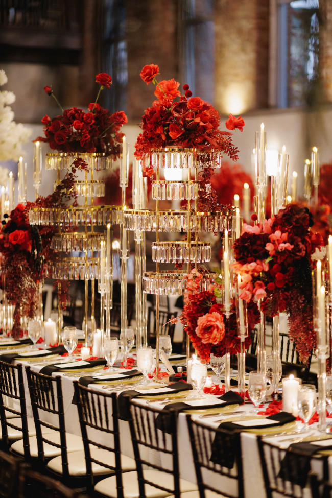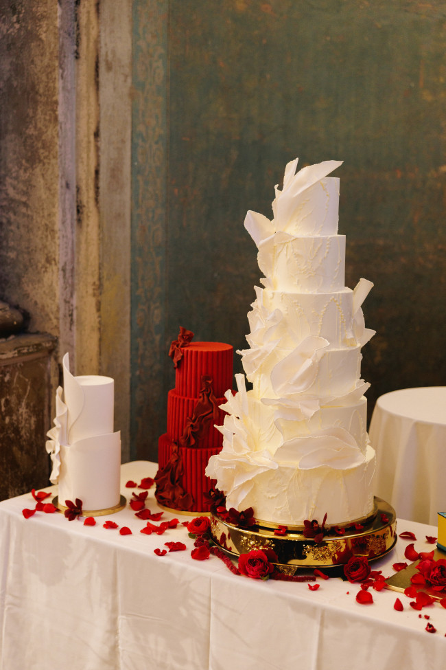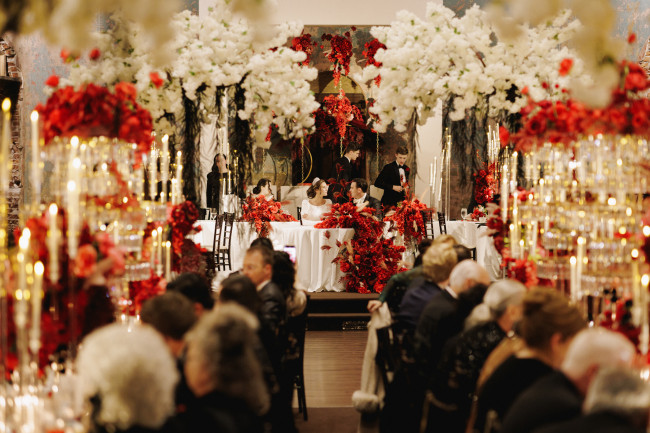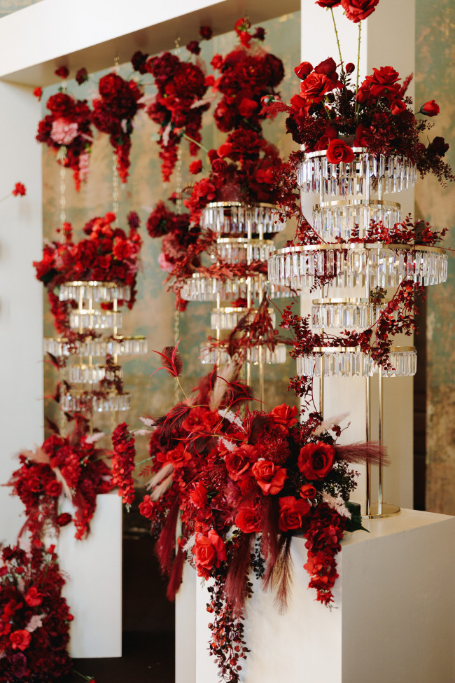 SE: Our wedding day was designed and planned to feel as deeply romantic as possible, and it was nothing short of that. It was filled with rich, passionate reds and the most dreamy florals I could have imagined that created a breathtakingly enchanting atmosphere. One of my absolute favorite design elements in our décor was the majestic row of hanging trees that lined the entryway of the aisle. We also incorporated the most elegant, regal touches throughout all the décor, from our three stunning tiered cakes, to the grand floral installations that framed our ceremony and reception. Every detail of our day was carefully chosen to deeper reflect the beauty and depth of Ethan’s and my love story.
