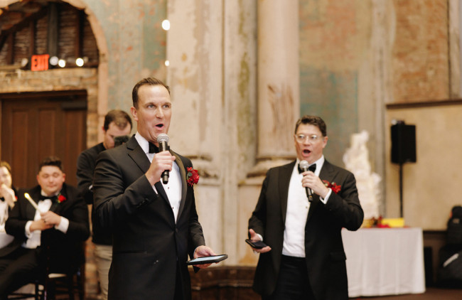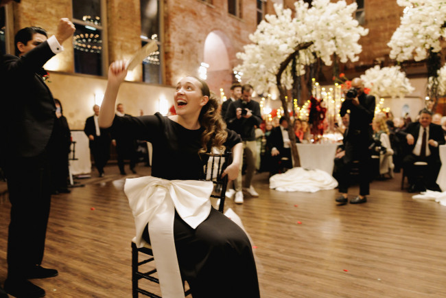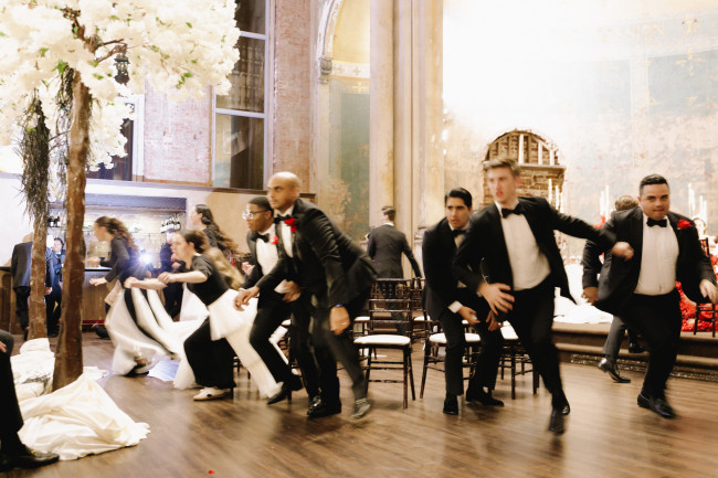 SE: One of the absolute memorable and entertaining moment from our reception was the bridal party game that also included all the guests in the crowd. The game was a mixture of both musical chairs and a scavenger hunt. It worked very simply: our MCs would call out a random item, and our bridesmaids and groomsmen had to race to find it, simply by asking the guests! Whether they found the item from a guest purse, pocket, or even wallet, they had to search the room and convince a guest to hand it over as quickly as possible. Whoever returned to their seat last was eliminated from the game! The competition got very intense, the girls' heels were off, and the crowd was cheering them on! It was so fun to watch from our table and truly such an enjoyable way to get everyone engaged and made for the most incredible memories!