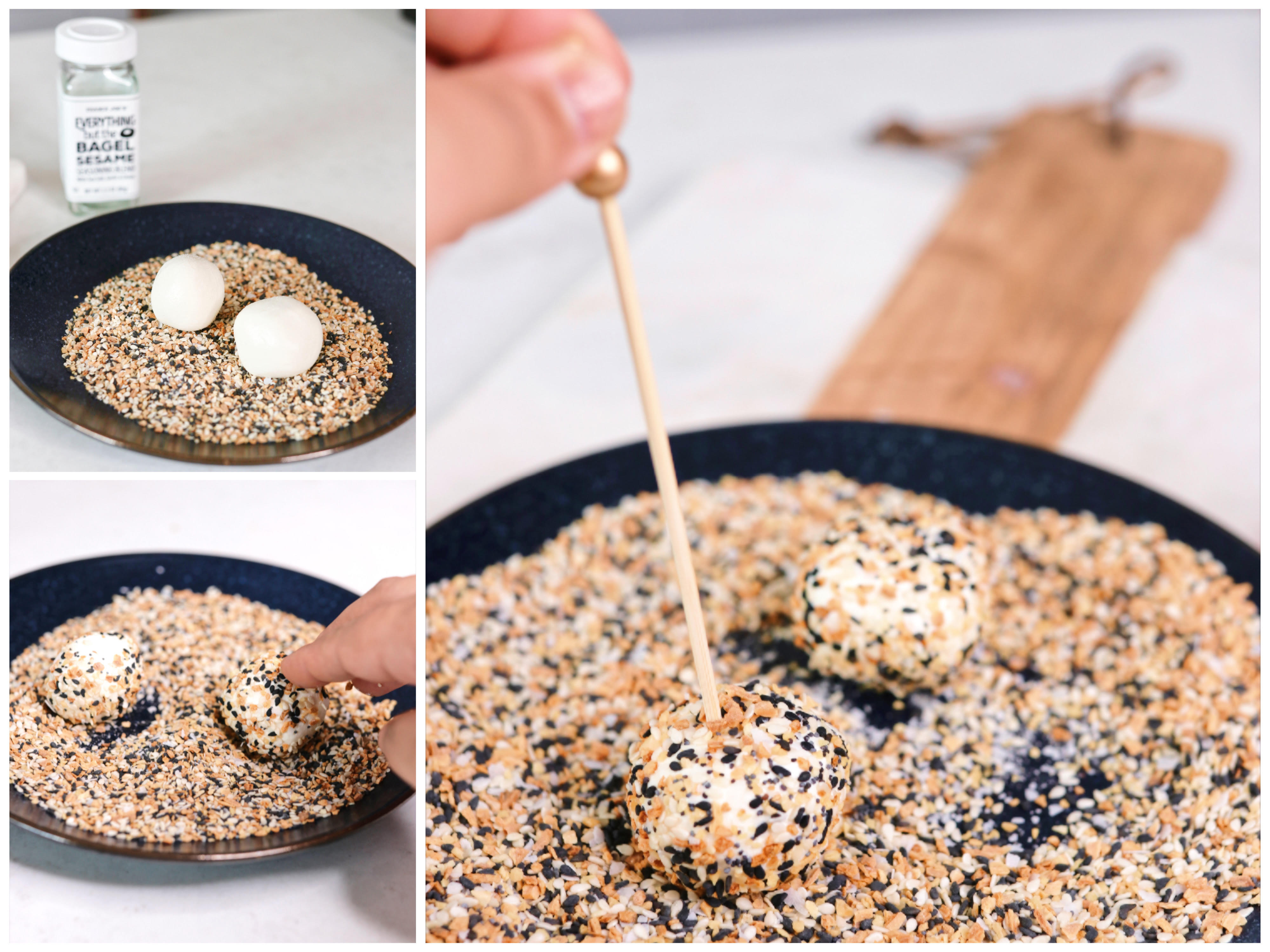 In a small plate, add the EBTB sesame seasoning and roll the cream cheese bites until covered. Then stick the skewer and it’s all done!