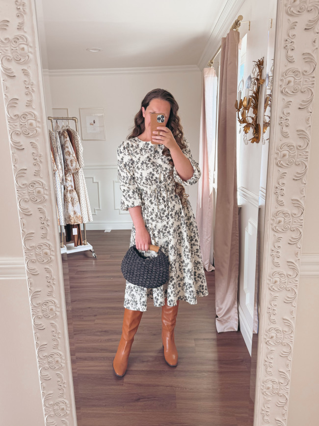 The Let Love Blossom dress just released last week in a black and white floral pattern, and this dress is just fall everything! Made of a light corduroy fabric for extra coziness, this dress is so flattering with the draw-string waist and A-line fit. This is the perfect dress for the apple orchard! Or pair with boots (like I've done here) for a coffee get-together with your friends.