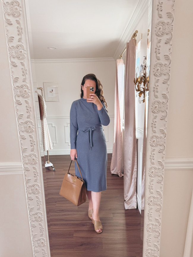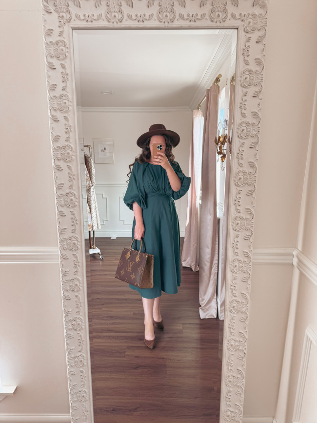 This green dress (releasing soon) is perfect for transitioning from fall events to winter holidays. Think fall family photos (that double for Christmas pics!) with pumps and a felt hat.