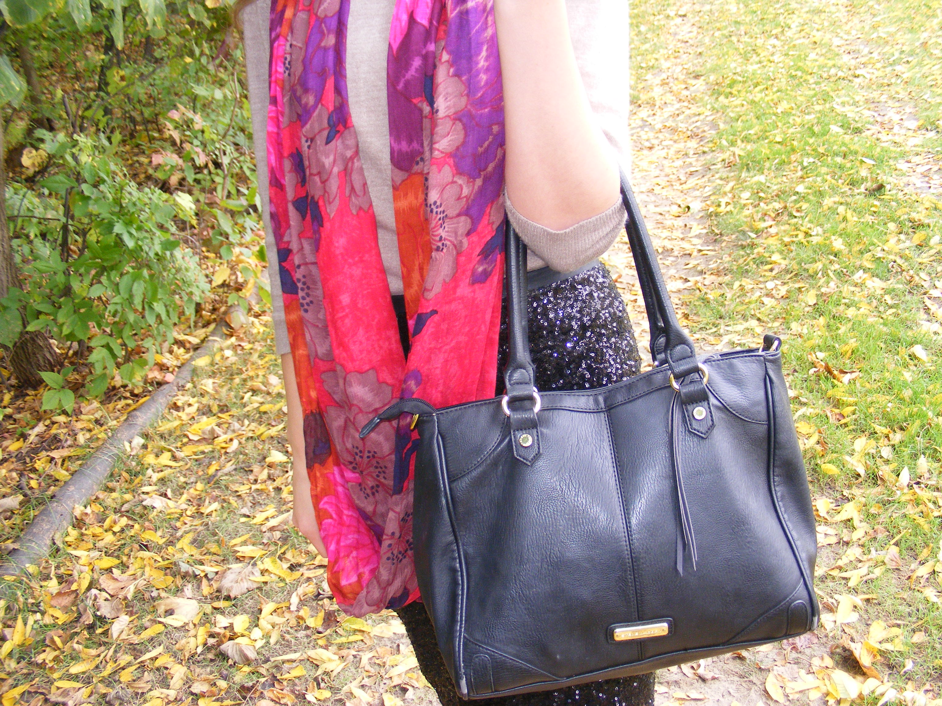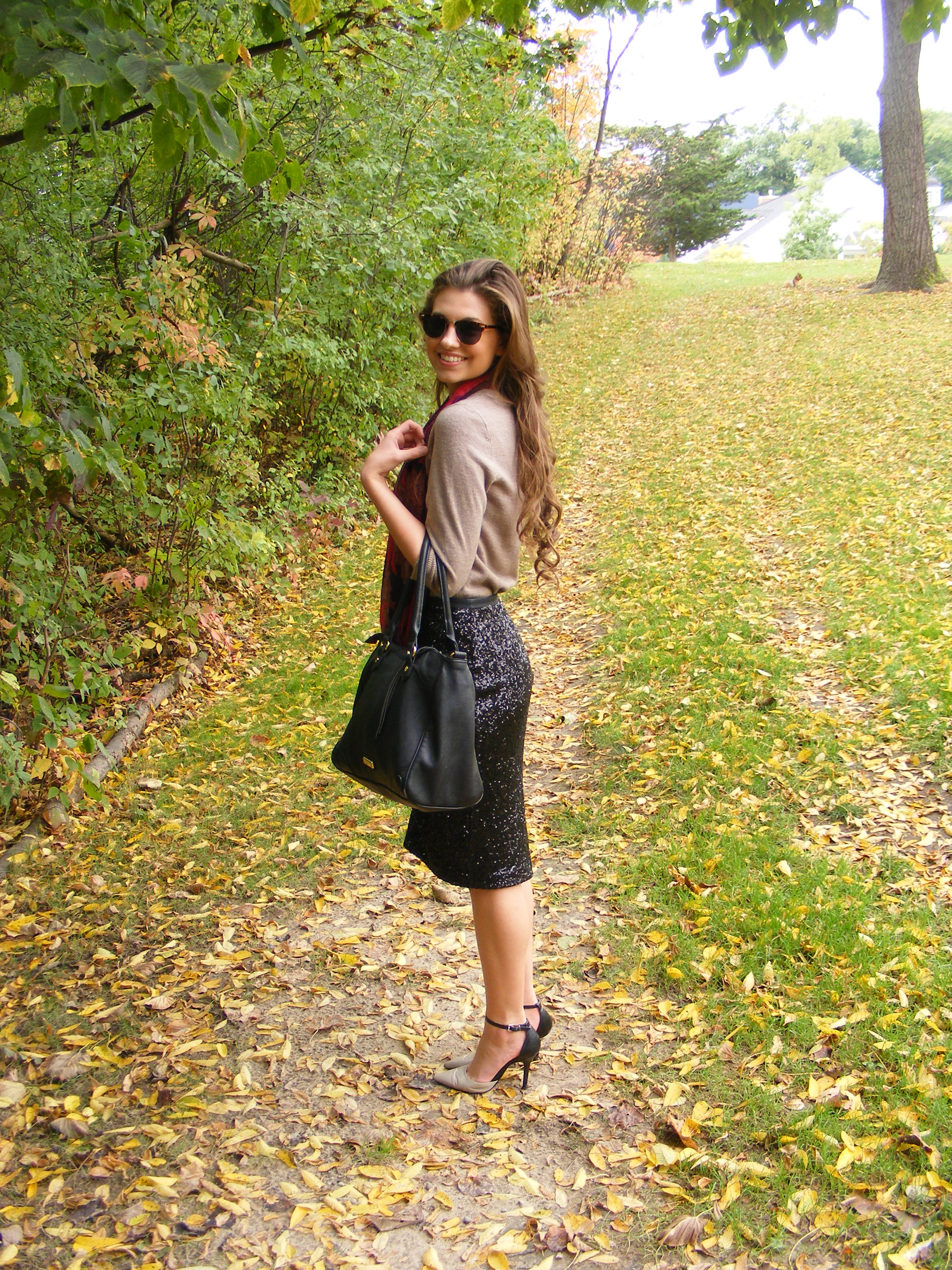 Let’s be honest and admit that we all experience those times; however, you can easily limit outfit crises by simply being prepared. This outfit is one of my favorite looks because it is so simple. I am basically wearing neutral colors with my scarf as the pop of color. I encourage you to invest in pieces that you can wear continually, as well as pieces that are versatile. A sequin skirt is definitely a go-to piece in my closet because it instantly transforms the typical black pencil skirt into a dressy statement piece. Pairing it with a brightly colored scarf gives the ensemble a unique fall flair that I absolutely love. I am also a huge fan of a skirt with a high waist band; this one is leather, and gives the skirt that perfect balance between trendy and classic. My shoes are two-toned leather, and I must say I am obsessed with these shoes and wear them constantly.