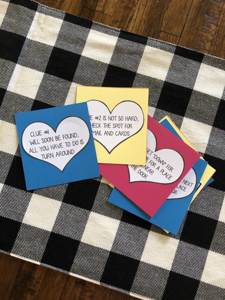 While they were gone, I set up a treasure hunt via clues I’d found (and tweaked a bit) off Pinterest. I hid two small treasures at the end of the treasure hunt — one for my son and one for my husband.