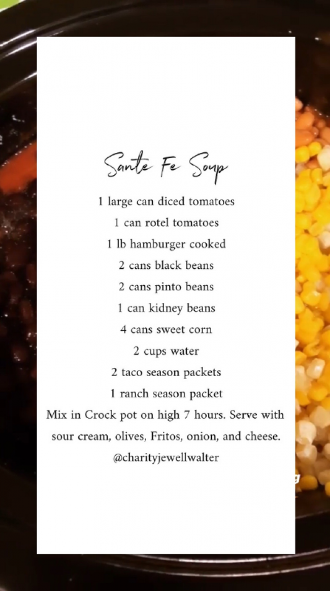 The Santa Fe Soup recipe is similar to chili, but with so much more flavor. The combination of taco seasoning, yummy beans, corn, and tomato make a WONDERFUL chilly-night crockpot soup. (Who doesn't love an easy crockpot recipe?) And banana bread is a winner anytime!