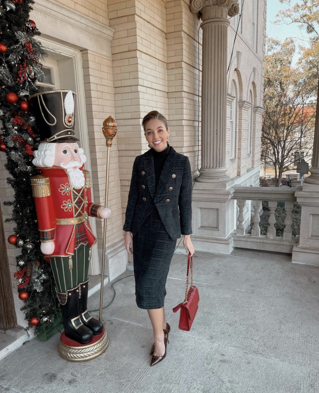 Annabeth (@annabeth.kirk) is no stranger to Dainty Jewells and always adds such class to our styles. She is seen here featuring one of our modest skirt suits - the Edinburgh Elegance blazer and skirt - perfect for a classy Christmas outfit!