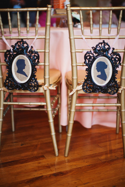 These silhouette signs are just darling for the bride and groom! I personally love the black framed design, but you could also incorporate these signs with other colors, too. If you have a local Michael’s, Hobby Lobby or another craft store nearby, that would be an ideal place for crafts and home décor for a decorative picture frame such as the ones shown above. This is a stylish and unique alternative for the typical “Mr. & Mrs.” chair signs for the wedded couple!