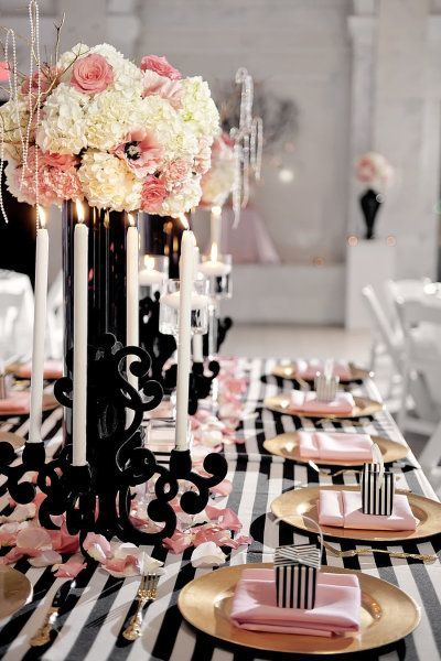 I love how enchanting and abstract this photo looks. From the stylishly black candlestick holders, to the pastel flowers and golden tableware — it’s all fabulously topped off with a striped tablecloth!