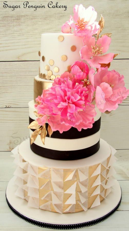 This jaw dropping cake is an extravagant work of art. If you were looking for a depiction of what a striped and floral wedding themed cake should look like, well, this would fit perfectly! This four tiered cake is the epitome of girly and chic. The black stripes with the draping pink flowers and gold ornamentation create a rich and wonderful contrast!