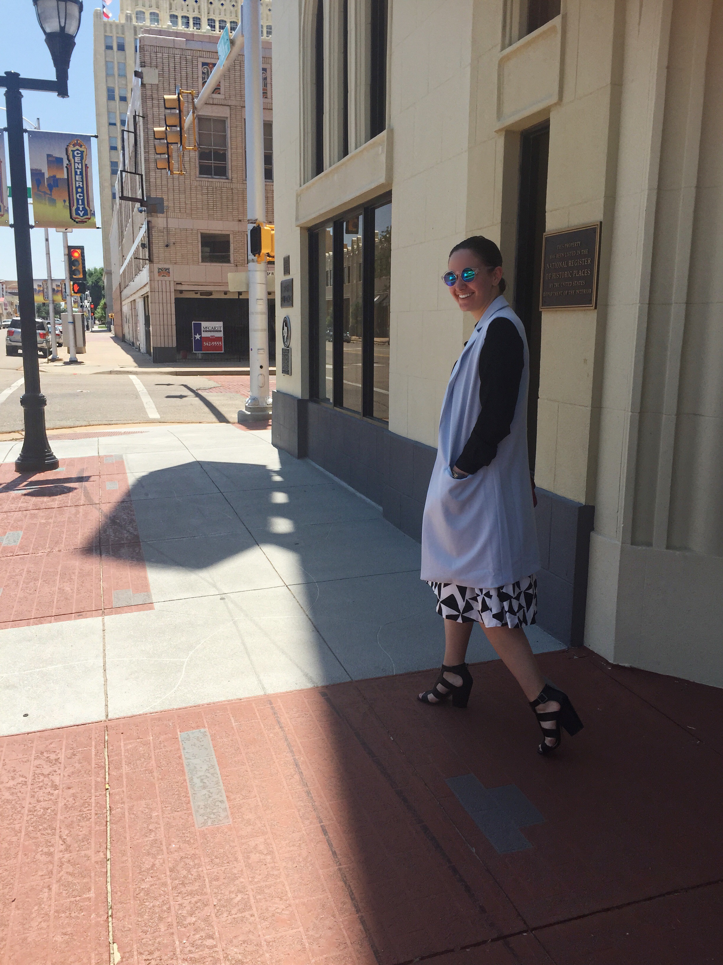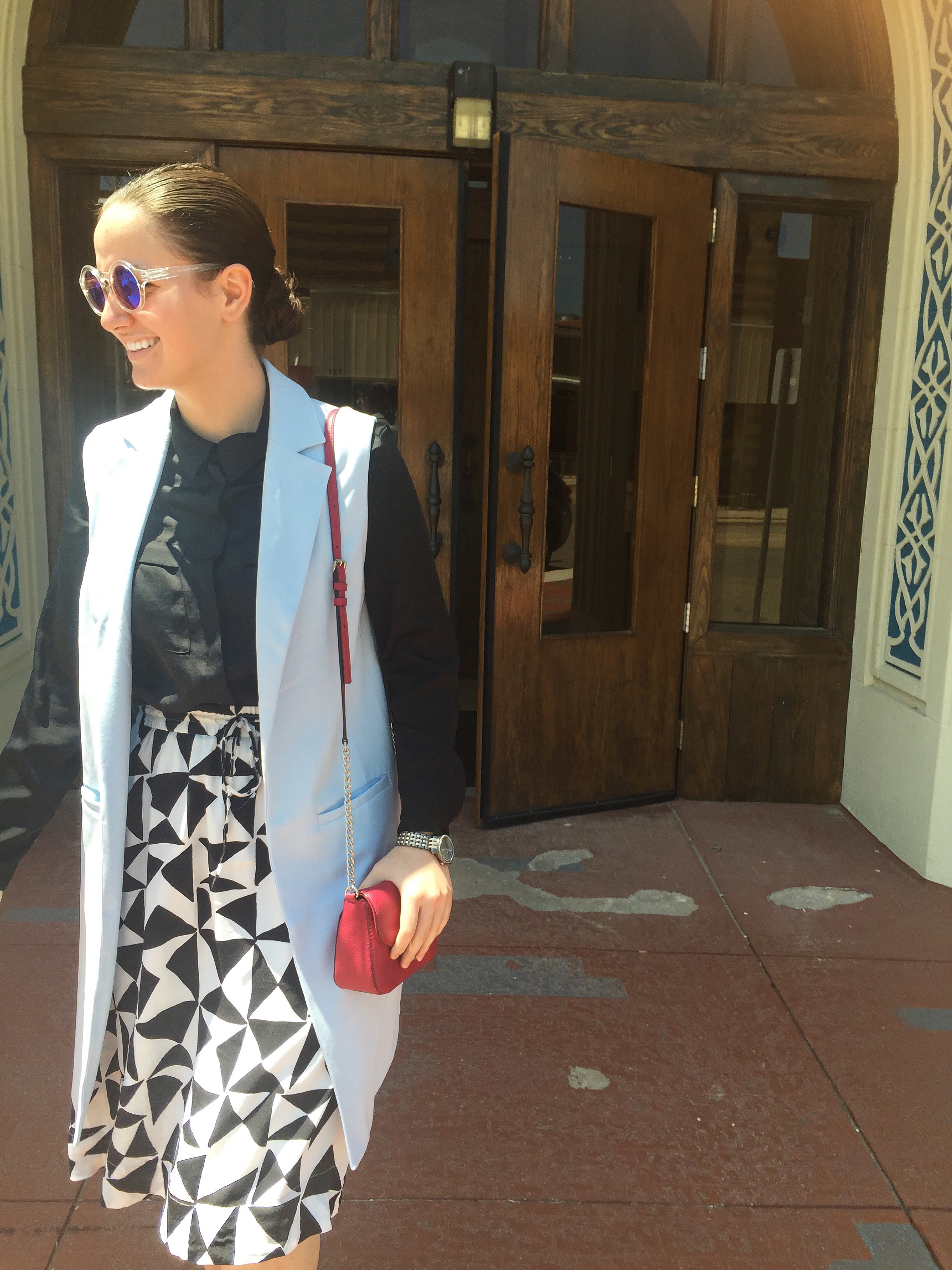 A soft shade of blue was the pastel of the day for me with my vest from XXI coupled with my black-and-white (of course) geometric skirt from the Loft. Paired with my magenta Michael Kors purse because I was feeling a bit in need of a contrast and my standard Vince Camuto heeled sandal, my outfit was complete.