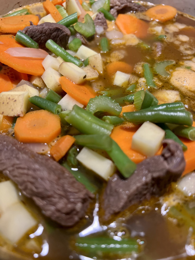 Slice, dice, and mince all vegetables. Heat a large Dutch oven (or cooking pot of choice) to high heat, drizzle with olive oil, and place the stew meat in to brown. Add salt and pepper to the meat while browning. When the meat is browned thoroughly, remove it from the Dutch oven. Place the onion, celery, carrots, and shallot into the Dutch oven and cook until the onions become translucent. Add garlic, Italian seasoning, and tomato paste and stir until the paste is well incorporated. Add the meat back into the Dutch oven, then stir in the green beans and potatoes. Add the bone broth and bring the soup to a boil. Once the stew reaches a rolling boil, reduce the heat and simmer for 3-5 hours or until the meat becomes tender. Season with salt and pepper to taste.