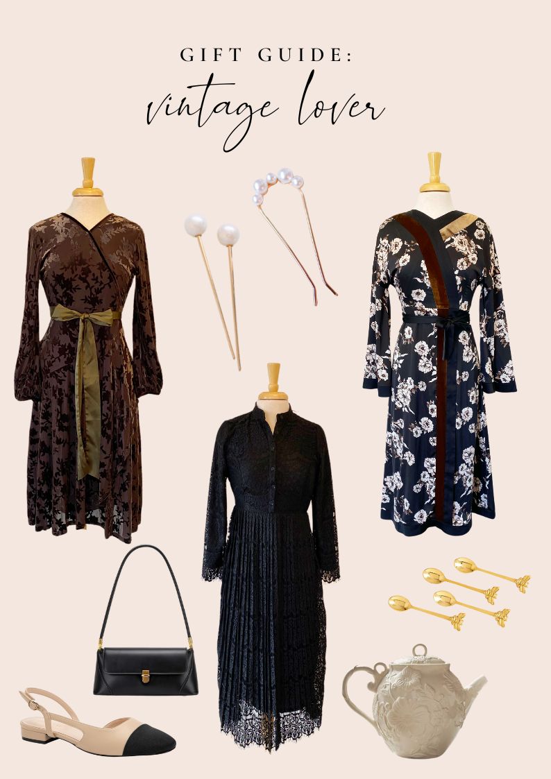 Featured items: Versailles in Velvet dress | Eclipse of Elegance dress | Tokyo Tea dress | Slingback shoes | Black purse | Pearl hair sticks | Pearl hair pin | Floral teapot | Bee teaspoons