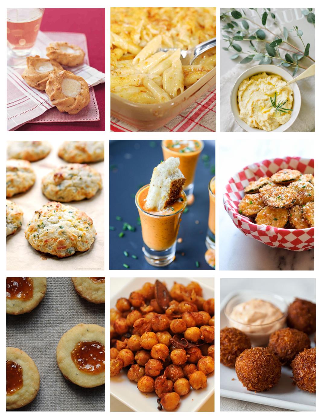 Ham & Gruyere Thumbprints (delicious) Beecher’s Mac & Cheese (the best ever) Roasted Butternut Squash Ricotta Dip (this just sounds delicious) Sour Cream Cheddar and Chives Drop Biscuits Recipe (I’ve been dying to make these – so many good flavors) Creamy Tomato Soup Shooters with Grilled Cheese Sticks (can’t wait to try these!) Zucchini Parmesan Crisps (just say yes!) Fig & Blue Cheese Savouries (like four ingredients – super easy!) Smoky Fried Chickpeas (these look different but yummy) Serrano Ham & Manchego Croquetas (more complicated but the flavor sounds amazing)