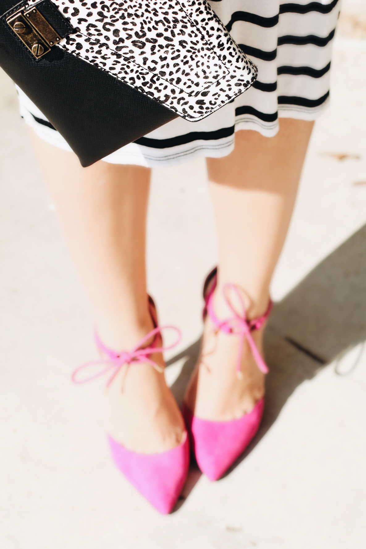 For my second outfit, I added a cute black and white printed clutch from J. Crew Factory and some super cute fuchsia heels from Asos! It’s all about your accessories when dressing up your comfortable dresses. I think the mix of patterns with the dress and clutch make this outfit so cute!