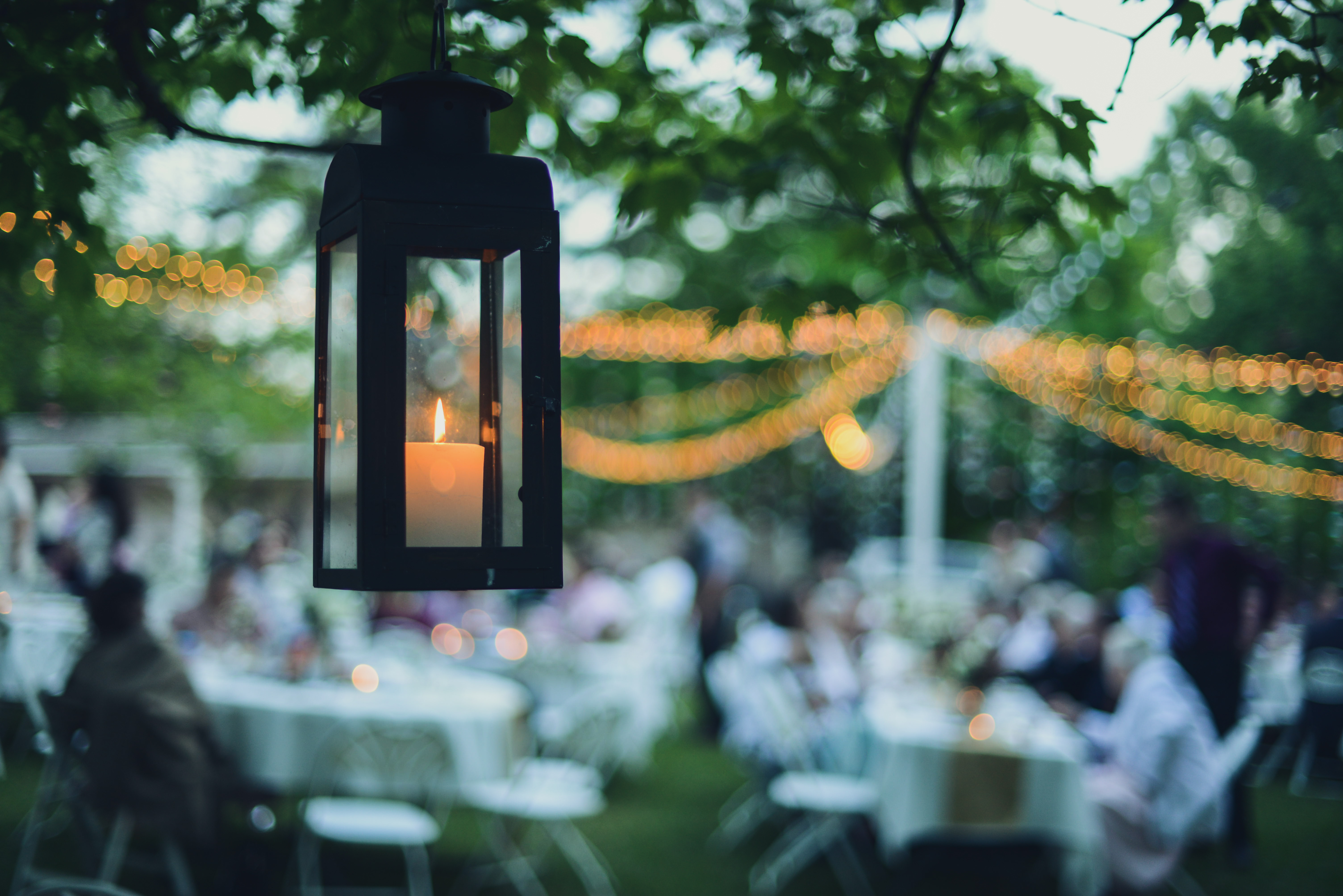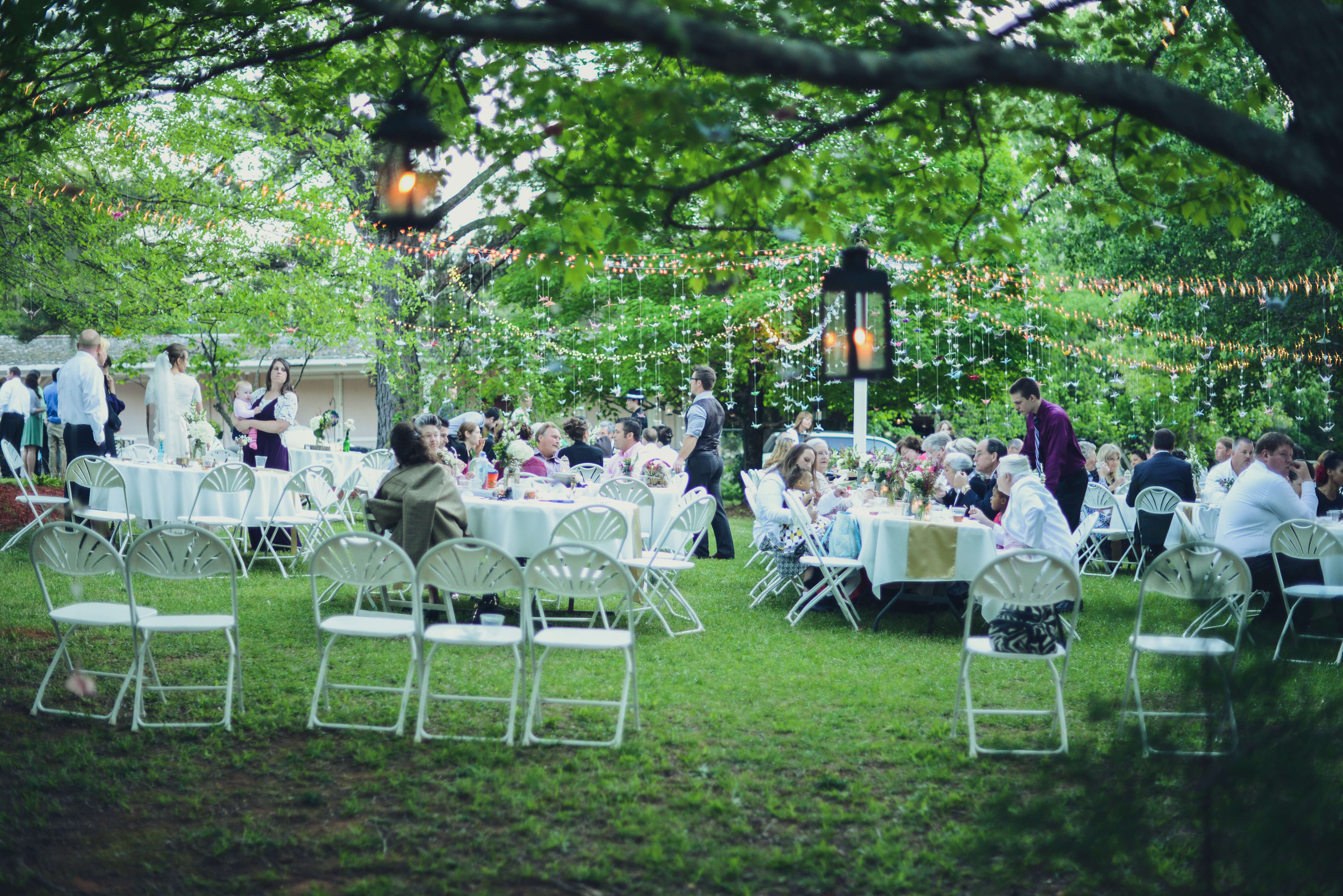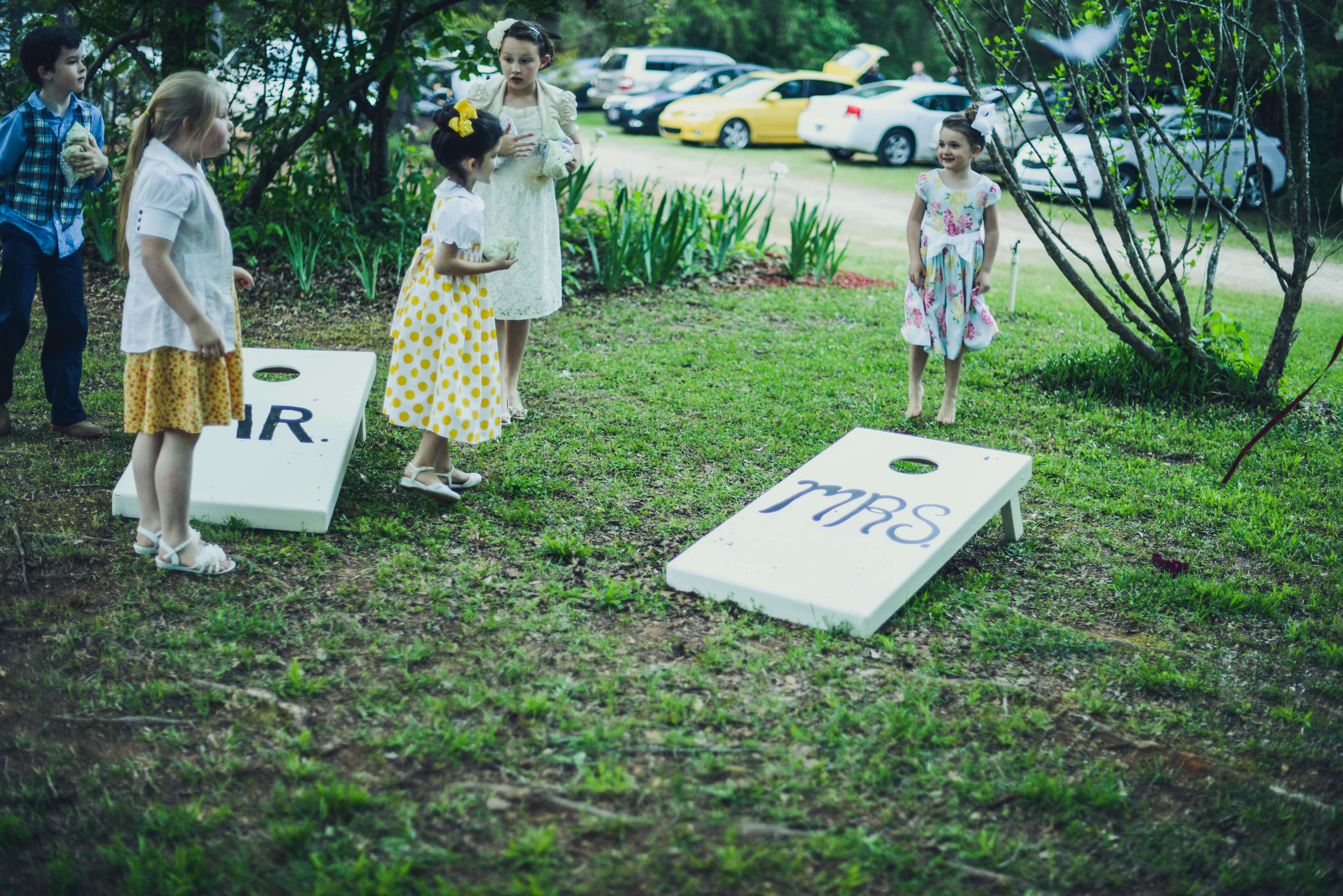 We wanted an atmosphere that everyone could feel comfortable in, we wanted people to feel like they fit in. I wanted a relaxed and fun feel, almost like an outdoor evening dinner party. We had lights strung up in the side yard with lanterns on the tables and hanging from the trees. There were fresh flowers everywhere; part of the benefit of having an outdoor wedding is nature is already so beautiful you don’t need to add much to make an event feel magical. I also wanted everyone to have fun — I know sometimes weddings can get kind of boring for kids so we had corn hole to play and also little goodie bags for the kids with game booklets and pictures for coloring. I had found a lot of little vases at garage sales for flowers along with mason jars, we had wooden slabs to arrange things on or vintage looking books, small picture frames with love poems inside, and candles adorned the tables. A thousand origami cranes hung from the lights overhead and music from Frank Sinatra, Louis Armstrong, Henry Mancini, Nat King Cole, and Billy Holiday played in the background.