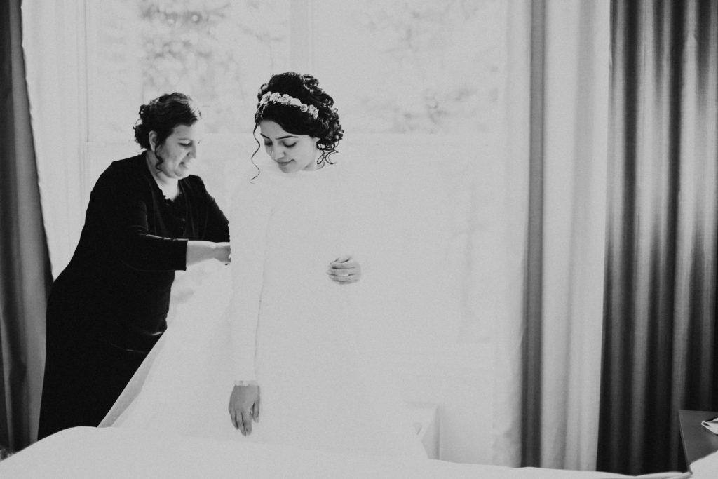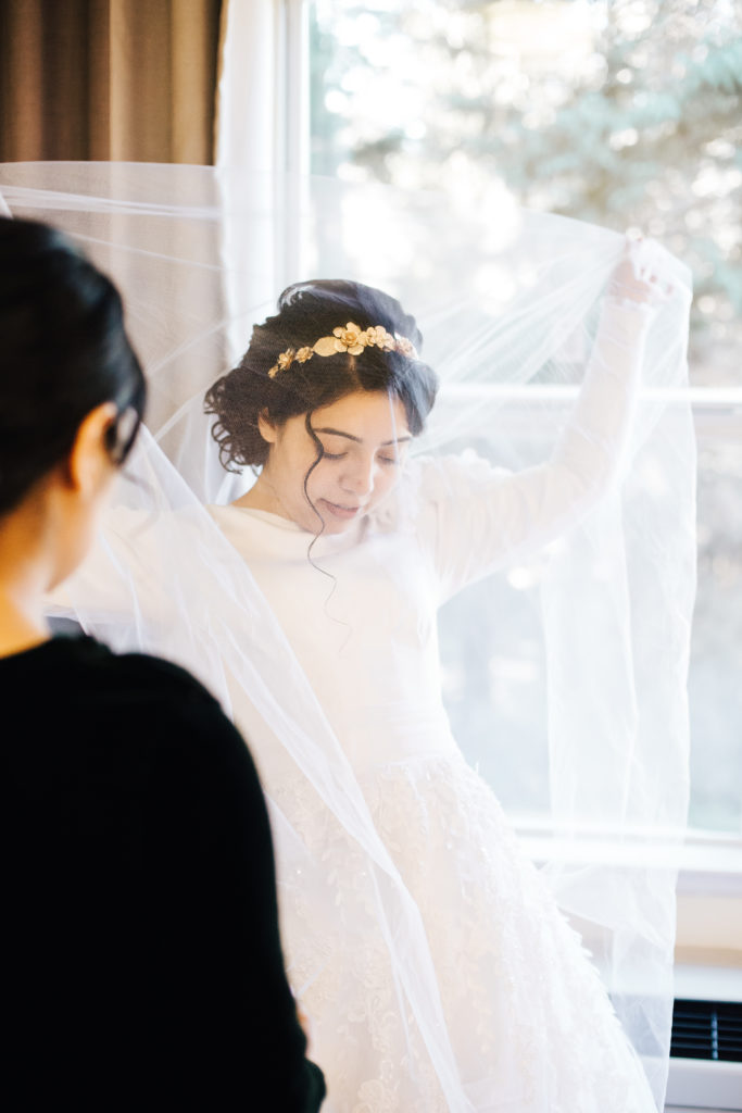 Oh the joys of finding the perfect modest wedding dress! My mom is one of my favorite humans in the world, and ever since I can remember, I have wanted her to make my wedding dress. She is such a talented seamstress; I had no doubts she could make my dreams come true. My mom has worked with countless brides helping them alter their dresses to be modest. She made her own wedding dress. She sews countless of her own designs. But she had never completely made a wedding dress for someone else–until now. Needless to say, she was apprehensive about it, but the results were perfect! I had some ideas in mind of what I wanted in my gown: long sleeves, a timeless style, a high neckline, floral organic embellishments, a long train, and countless yards and yards of endless tulle. She was able to build upon my initial ideas and create something that was so much more than I’d expected. The gown my mom created was so special, and all of her thoughtful little details only made it all the more beautiful to me.