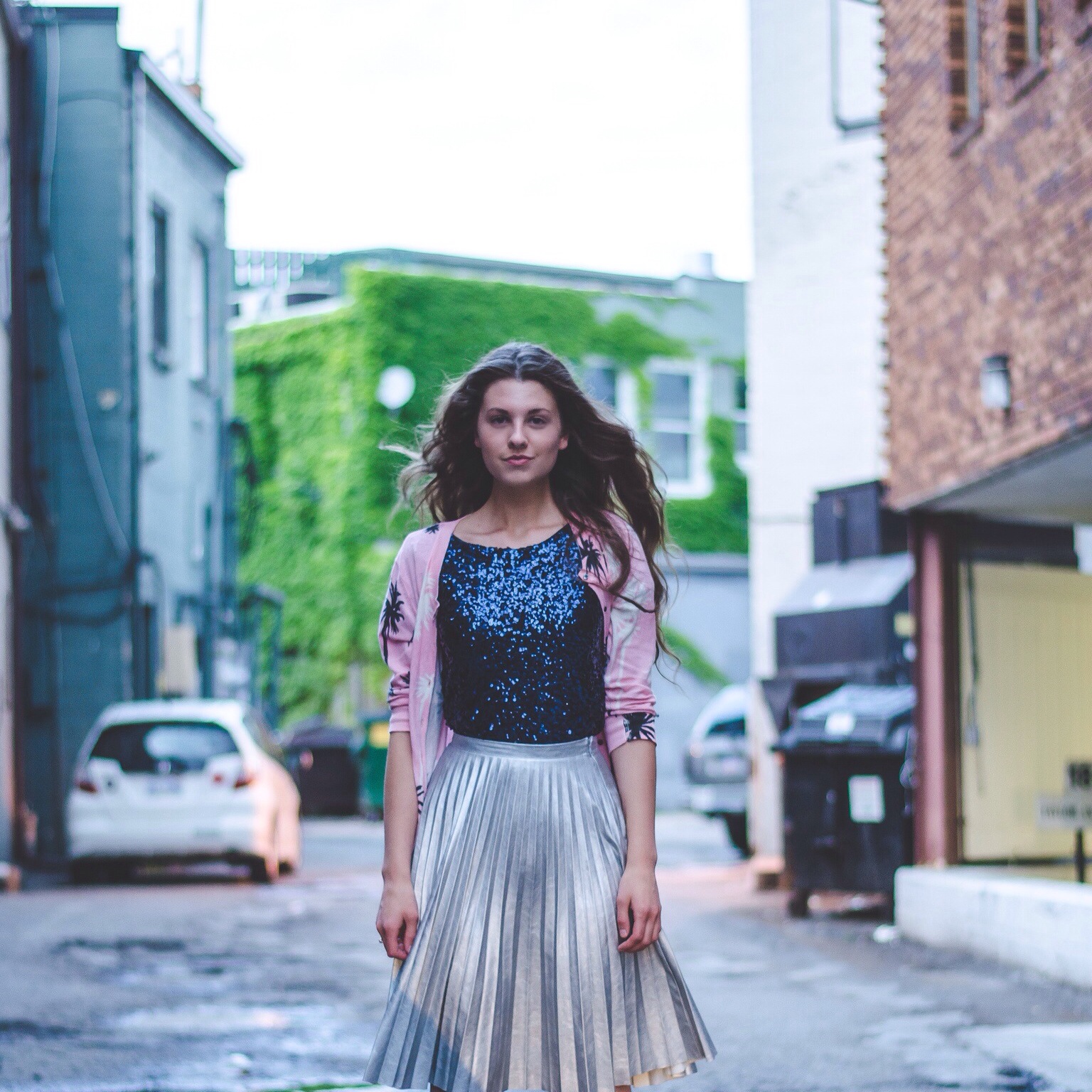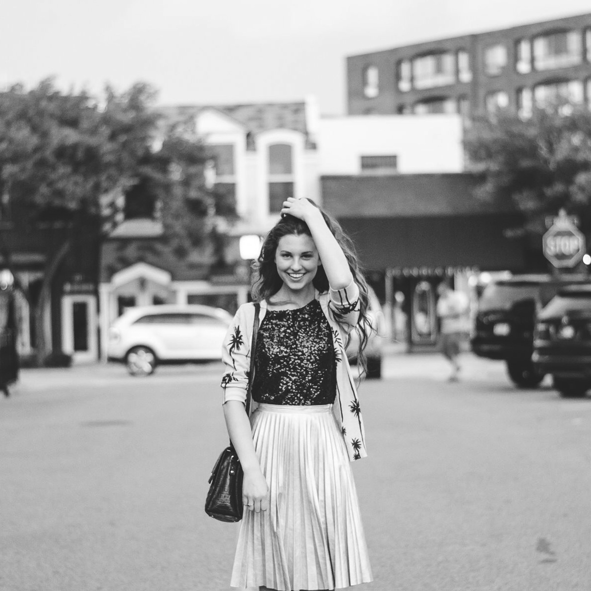 I paired the palm tree cardigan with a navy sequin top. I am a huge fan of sequins, as we all know, and I felt that tucking this top into my metallic, pleated skirt really gave it a modern edge.