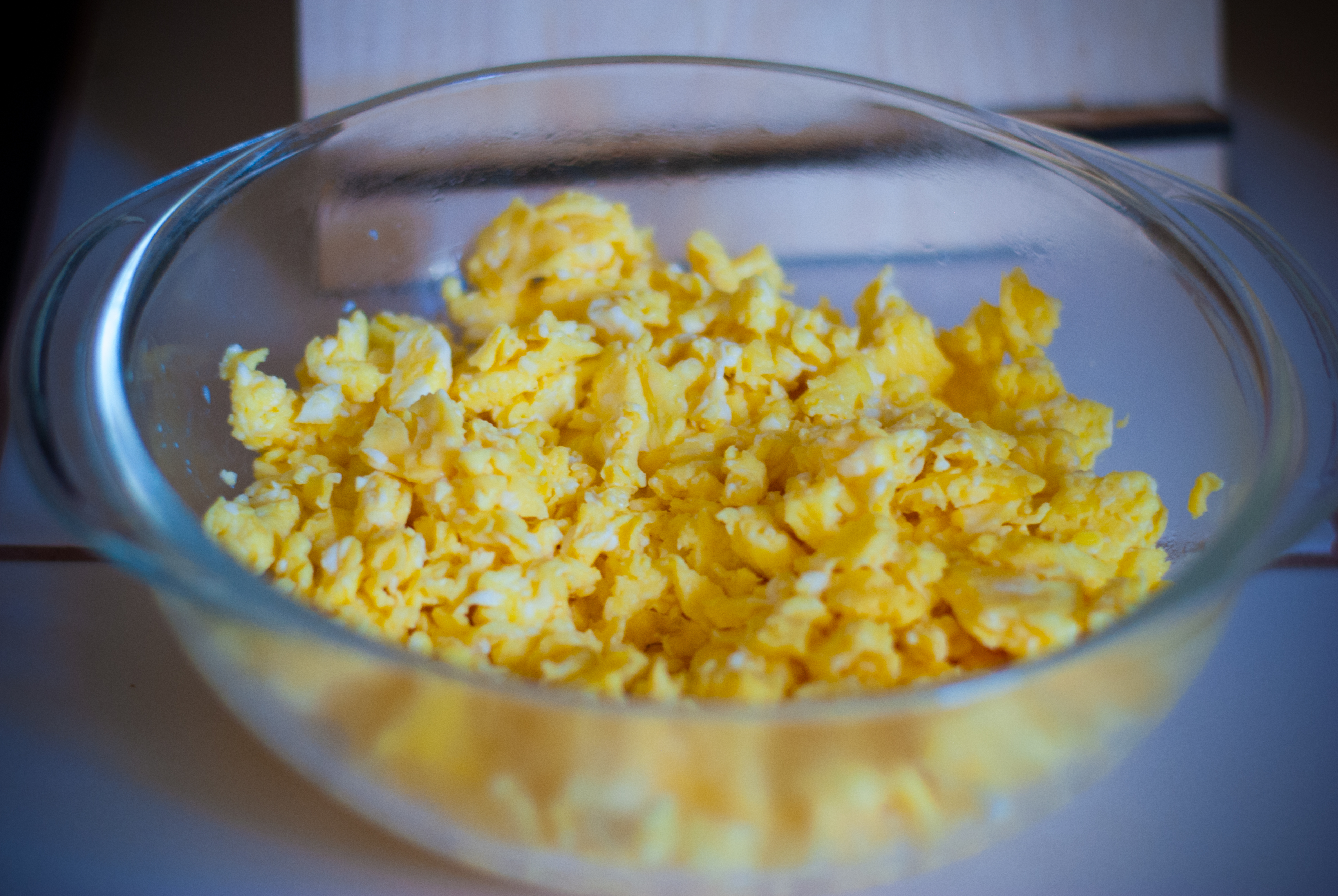 Begin by stirring 12 eggs over medium heat. Add salt to taste. After the eggs are scrambled, place them in a bowl and set aside.