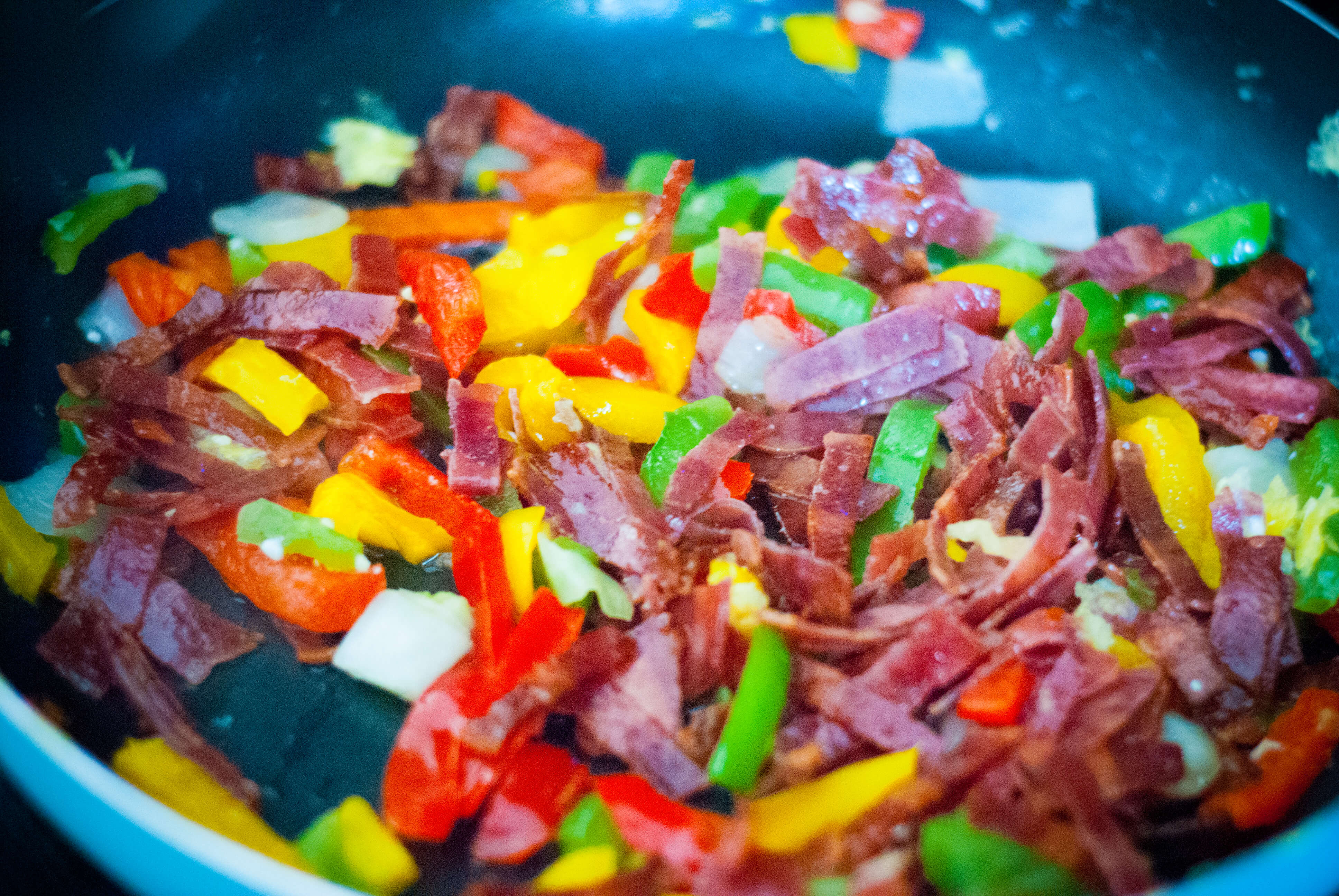 In the same pan, add frozen fajita onions, peppers and bacon while stirring occasionally until heated through.