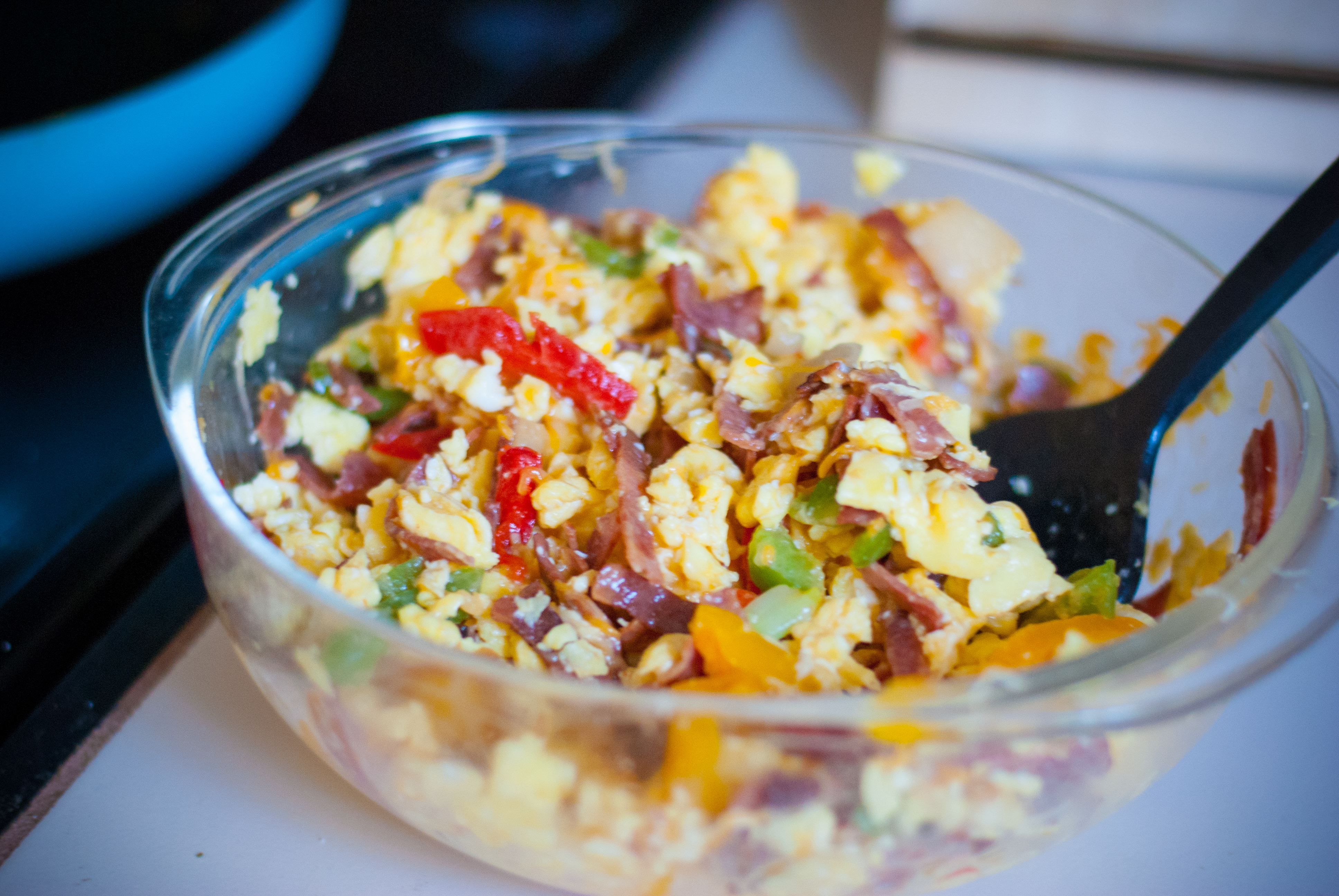 Add the veggies and bacon into the bowl of eggs along with the cheese. Stir it up and try to avoid devouring the whole bowl of yummy, cheesy goodness.