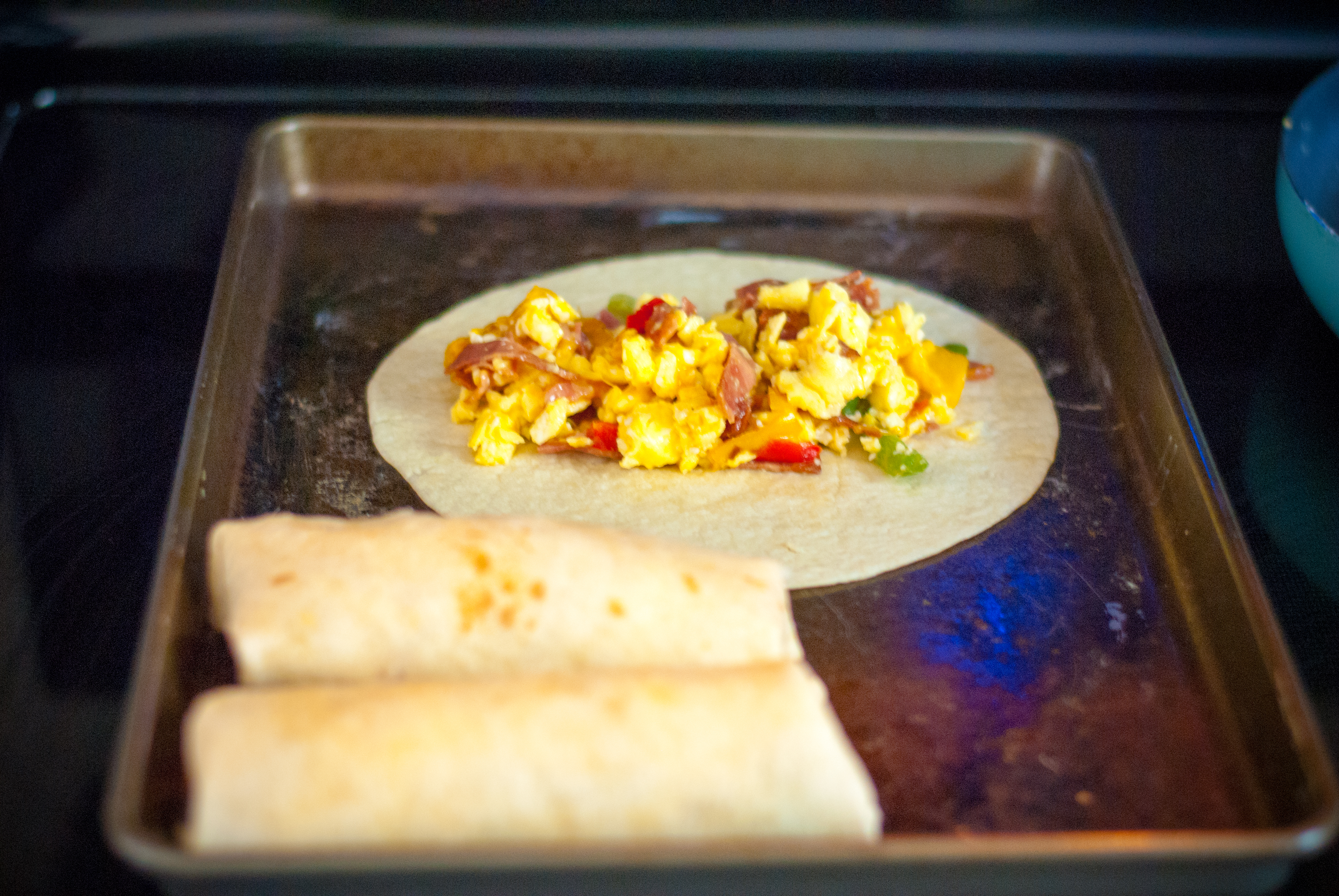Heat 3-4 tortillas at a time for 30 seconds in the microwave. Put 1/2 to 1 cup of mixture on the tortilla and and wrap burrito style. This should make 10-12 burritos, depending on how full you make them. Line up the burritos on a cookie sheet and place in the freezer for an hour. After an hour, put them in a freezer bag.