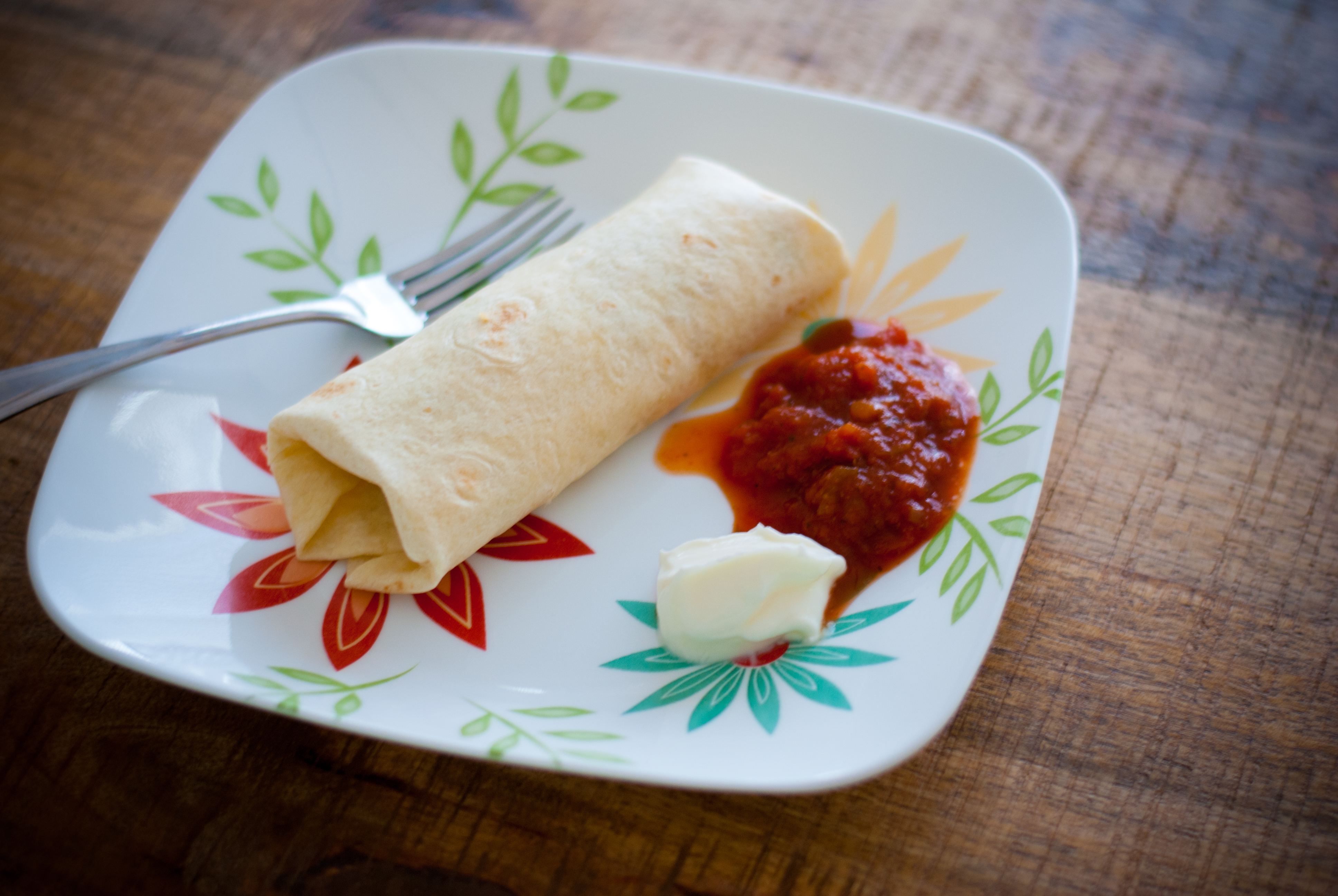 These burritos are great breakfast or lunch. They make up so quickly and they’d even be great to make for a crowd, too. I couldn’t help but eat one right after I made them – and boy was it yummy! I served it up with a dollop of sour cream and salsa. Bon appétit!