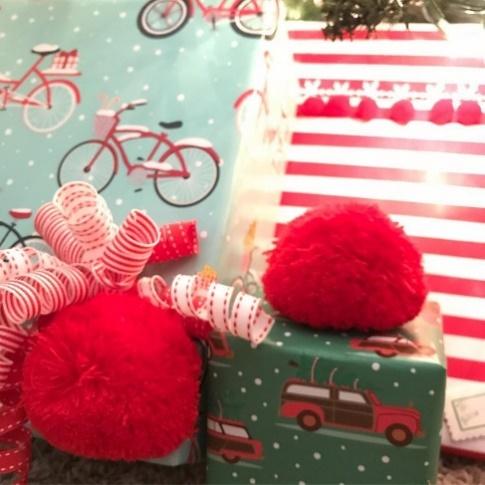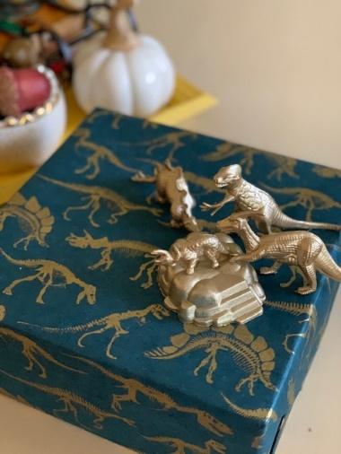 - Ribbon – wide grosgrain or wired ribbon is the trick to a beautiful bow. Cut ribbon at a slant or V shape to make a double-pointed edge. Also, look for “weird” things to use instead of a bow or ribbon. You can hot glue anything to a package! (Hello, spray-painted gold dinosaurs.)