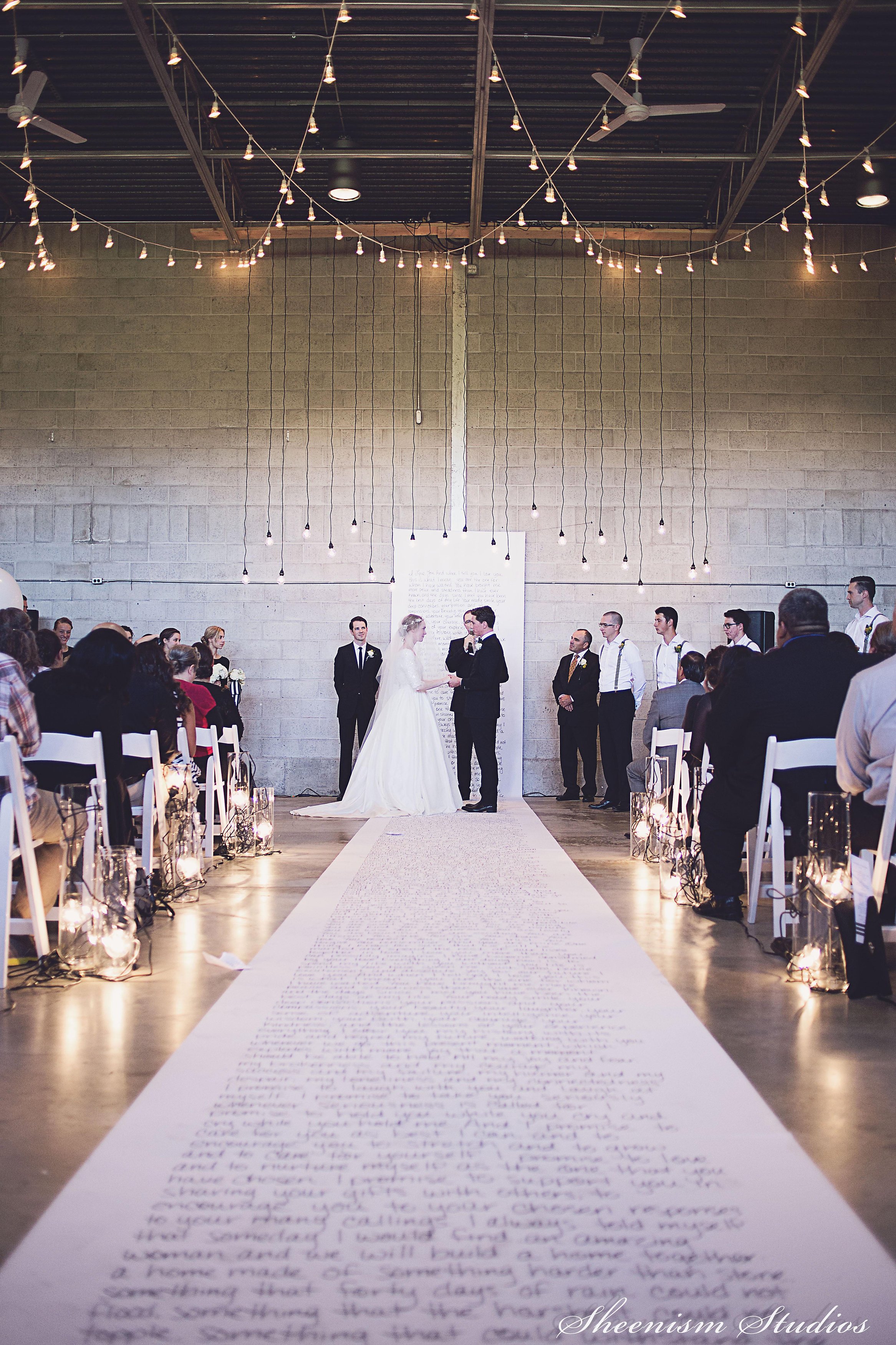 Our ceremony decor was comparatively simple. Using a combination of love letters we had written to one another, a very special, patient and exacting friend hand wrote our backdrop/aisle runner – a full 75 feet of it! It was the perfect centerpiece for our ceremony. We hung raw lightbulbs at random lengths on either side of the love letter, and continued the light bulb theme down the aisle, draping them in clear glass cylinders.