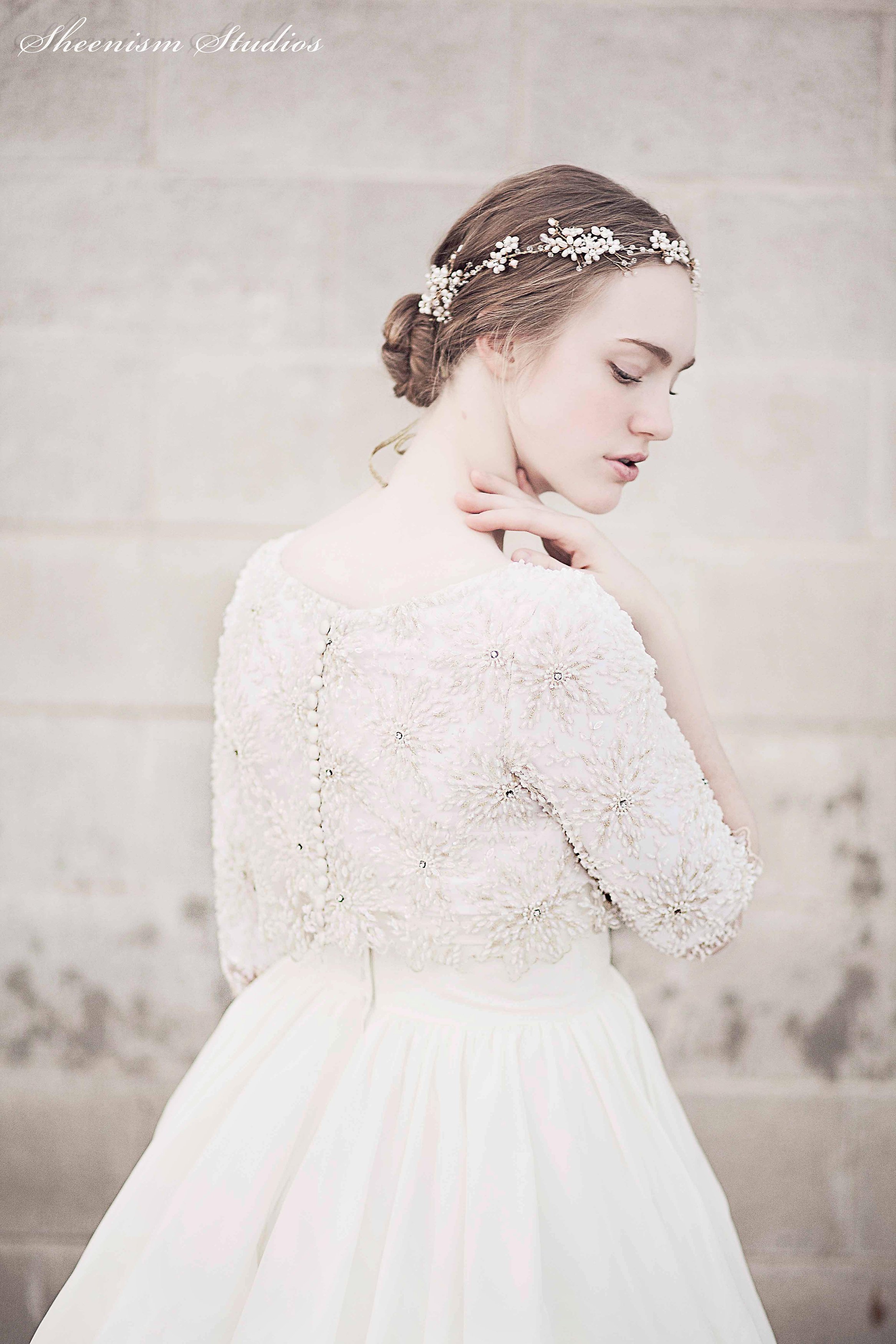 My dress was perfect; I would not have changed one detail. I felt like every bride is supposed to feel on her special day. The dress was a full, high-waisted silk, strapless dress. My amazing mom took almost 60 hours lovingly hand making my beaded crop-top. It was the crop top with its amazing detail that made the dress both sleek, simple and perfectly elegant. My headpiece was also made by my mom (she was very involved and instrumental in most aspects of our day — she knows me well! I love my mama). She used seed pearls, Swarovski crystals and over 50 feet of gold wire and hand twisted each flower that made up its incredible detail.