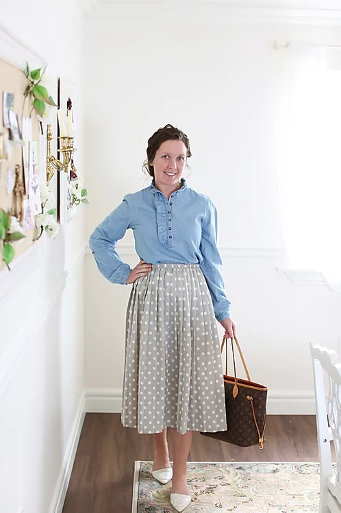 Lastly, I’d love to show you the Claire Top at Peony St. Boutique. This sweet chambray blouse has adorable ruffle details and buttons on the front that would pair so easily with just about any skirt in your closet. A red-and- white-striped skirt would pair wonderfully and add that extra something to your holiday outfit.