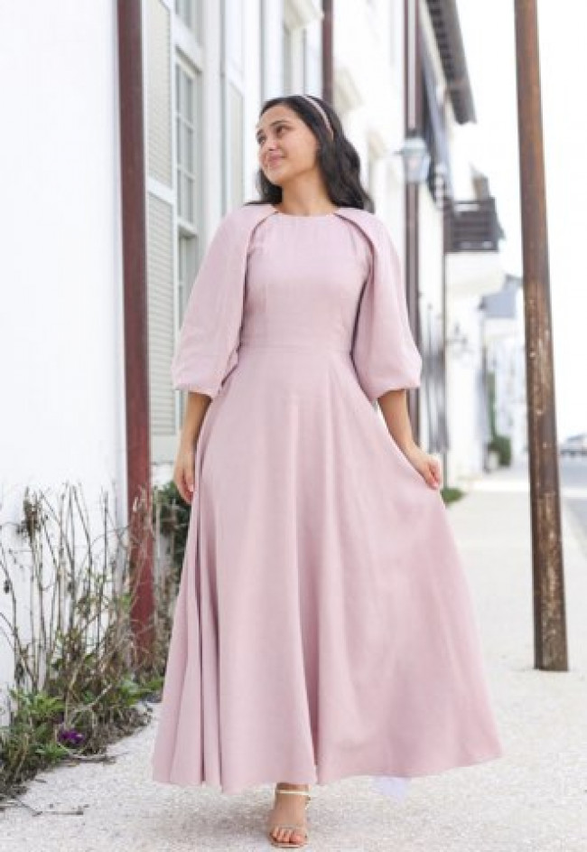 Maxi dress with statement sleeves. This dress, the Ray of Sunshine dress, is perfect for a modern, modest wedding. The fitted waist is flattering and the puff sleeves just make the dress.