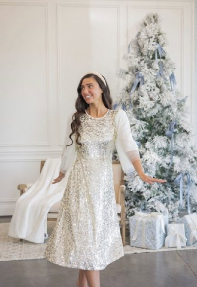 Sparkly midi dress for a touch of elegance. This dress is perfect for a winter wedding. The sequins and fluttering sleeves of the Starlight's Song dress give us all the elegant Christmas feels.