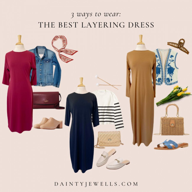 A modest layering dress can be styled so many ways. Pair with a denim jacket and mules for an early fall style. A cardigan or sweater over the shoulders gives a fancy look to this basic dress. Style a maxi-length layering dress with a cropped, embroidered vest and sandals for a boho, summer feel.