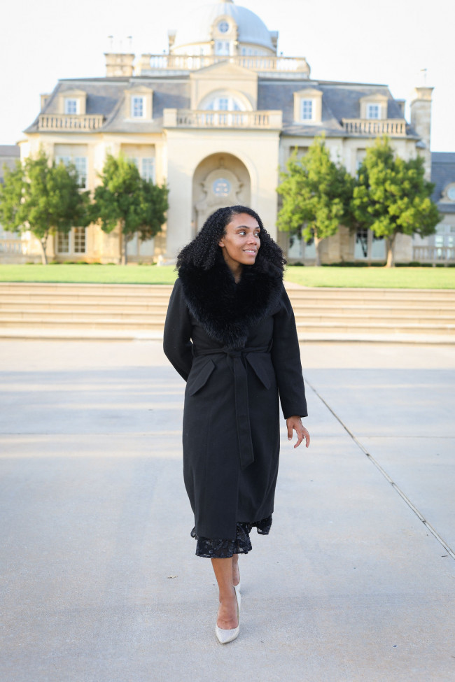 An elegant maxi dress and luxurious coat are beautiful together! Style this winter floral maxi with a grey, fur-collar coat for an elegant and formal look.