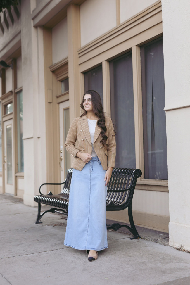 Pictured: Morning Stroll denim skirt & Coffee in Central Park blazer